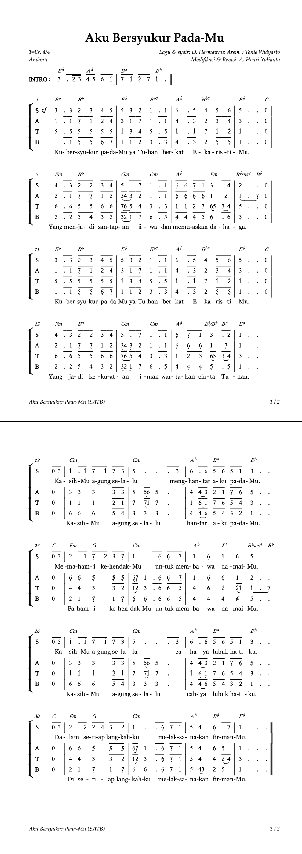 AKU BERSYUKUR PADA-MU | Lagu & Syair : D. Hermawan | Arsm : Tonie Widyarto | Mod & revisi : A. Henri Yulianto | Do=Es, 4/4, Andante |
