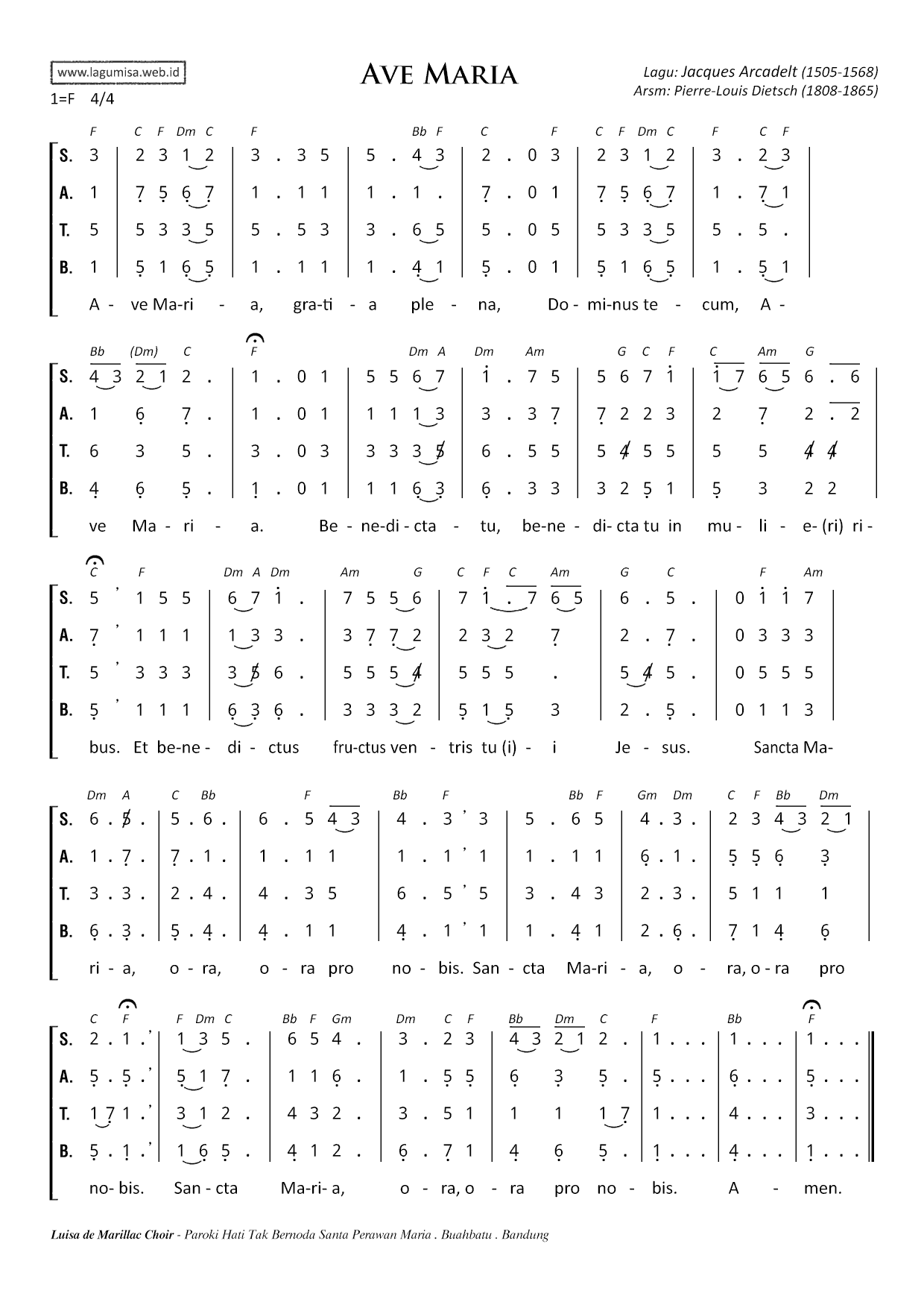AVE MARIA | ( ARCADELT ) | 1=F, 4/4 | Lagu: Jacques Arcadelt (1505-1568) | Arsm: Pierre-Louis Dietsch (1808-1865) |