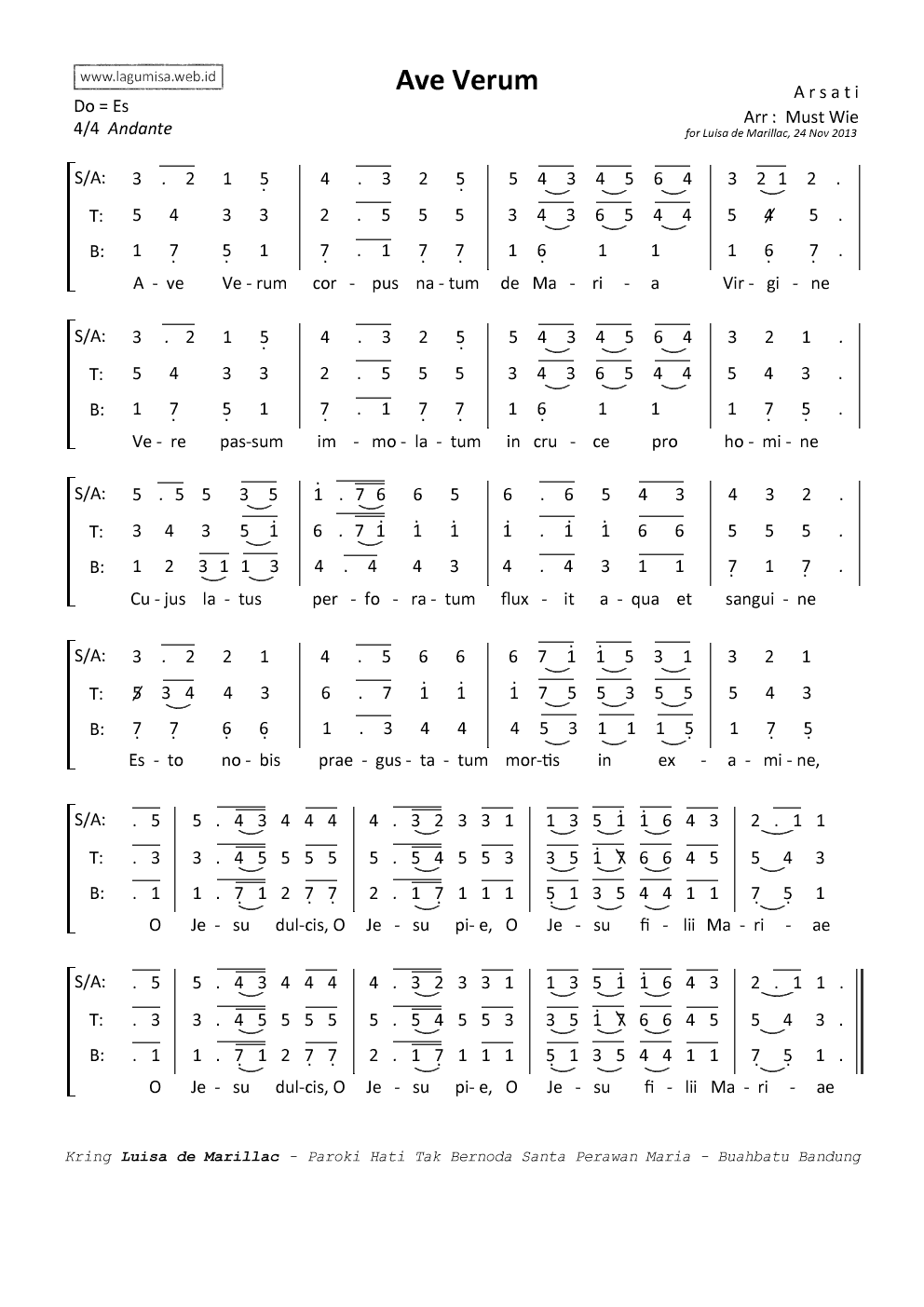AVE VERUM [ARSATI] | 1=Es 4/4 Andante | Lagu : Arsati | Arr : Must Wie |