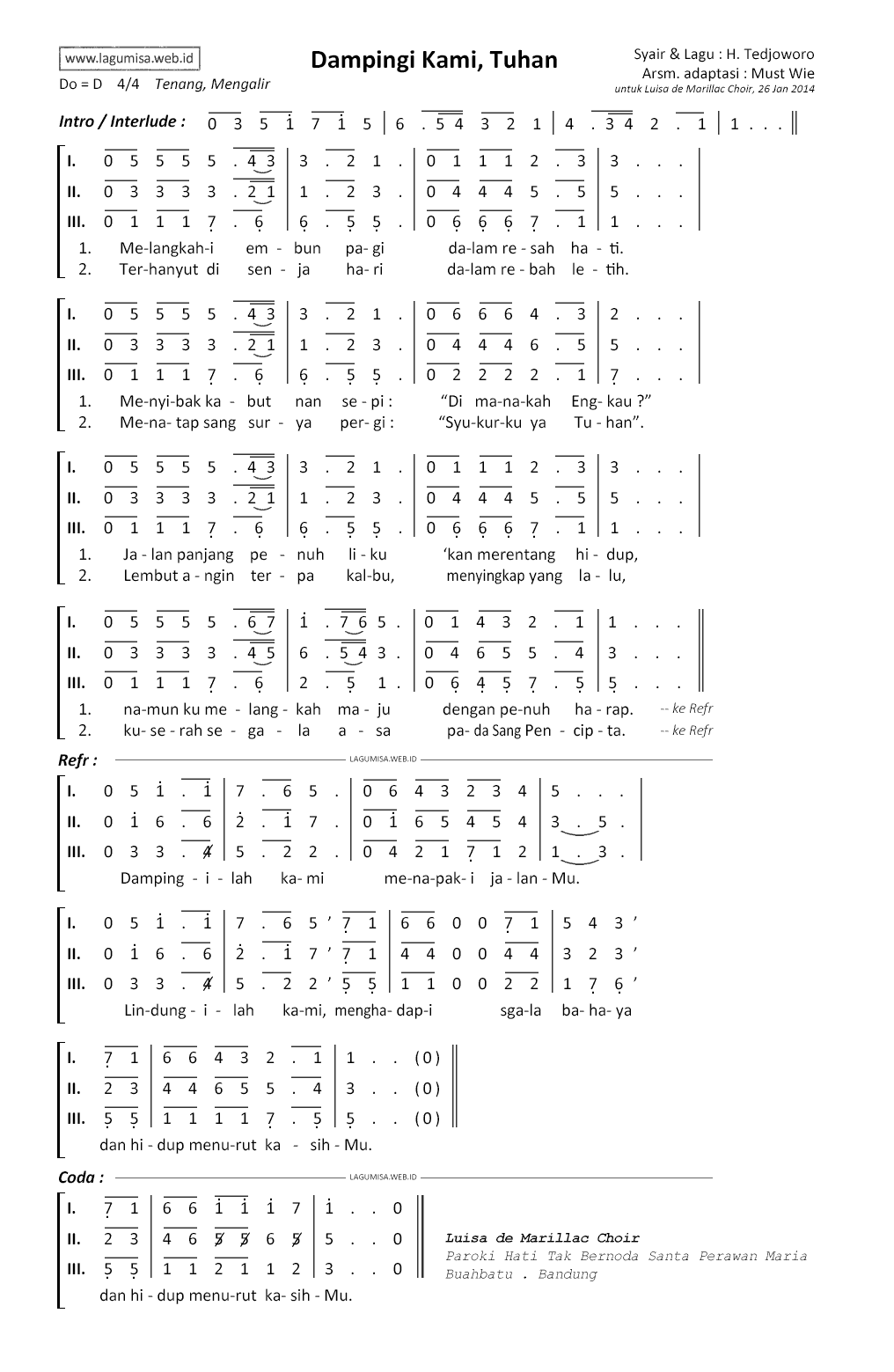 DAMPINGI KAMI, TUHAN | Do=D, 4/4, Tenang, Mengalir | Lagu dan Syair : H. Tedjoworo | Arsm. adaptasi : Must Wie (for Luisa de Marillac Choir - 2014) |
