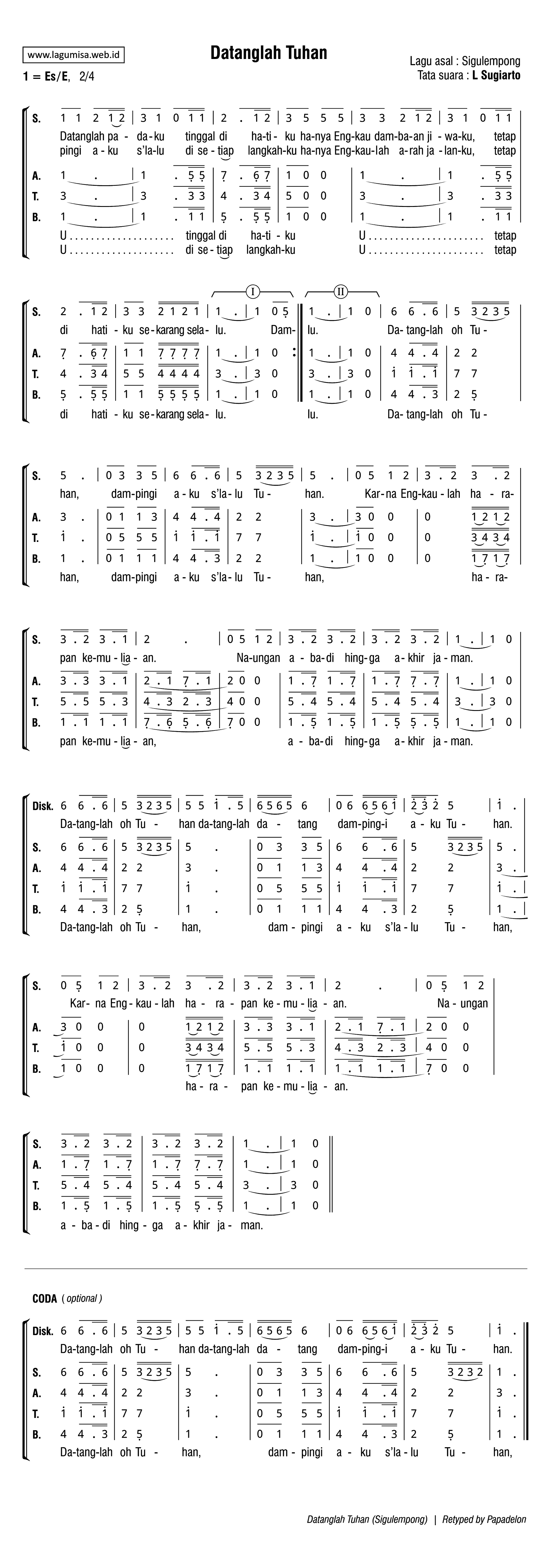 DATANGLAH TUHAN | Lagu asal : Sigulempong | Tata suara : L. Sugiarto | Do = Eb/E, 2/4 |