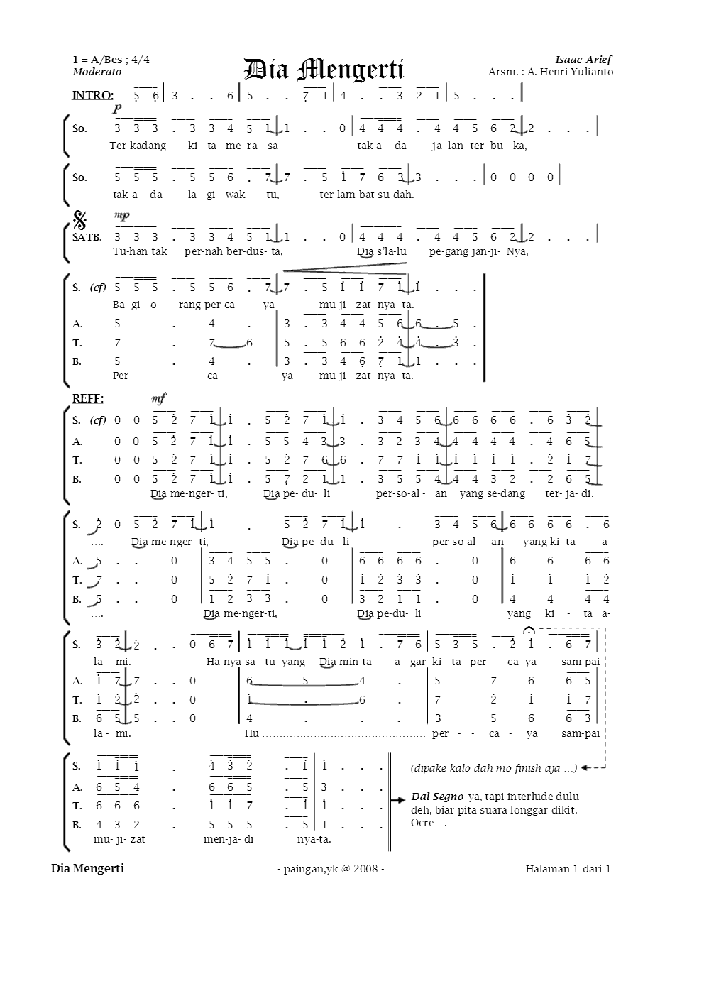 DIA MENGERTI | Lagu: Isaac Arief | Arsm: A. Henri Yulianto | do=A/Bes 4/4 Moderato |