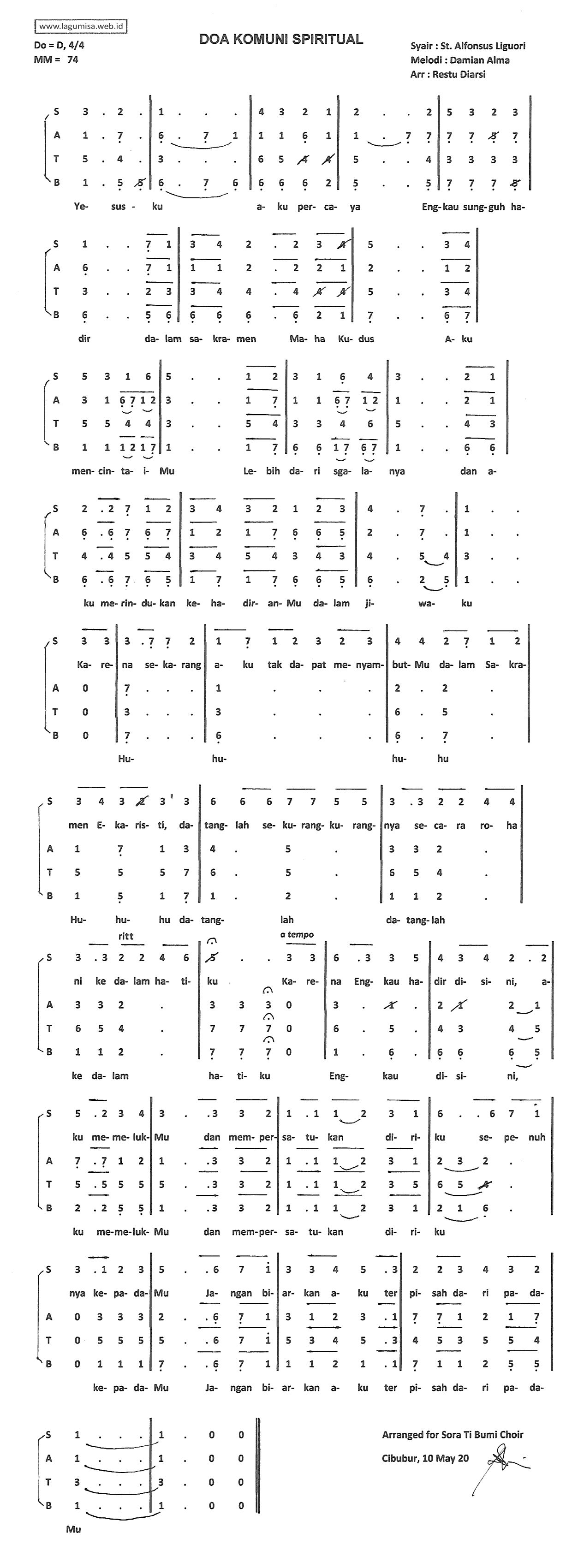 DOA KOMUNI SPIRITUAL | Untuk Paduan Suara SATB #1 | Syair: St. Alfonsus Maria de Liguori | Melodi: Damian Alma | Arr: Restu Diarsi ( Sora Ti Bumi Choir ) | 1=D, 4/4, MM=74 |