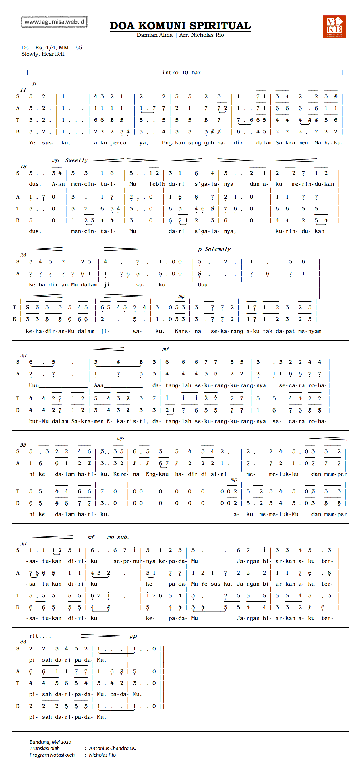 DOA KOMUNI SPIRITUAL | Untuk Paduan Suara SATB #2 | Syair: St. Alfonsus Maria de Liguori | Melodi: Damian Alma | Arr: Nicholas Rio | 1=Es, 4/4, MM=65 |
