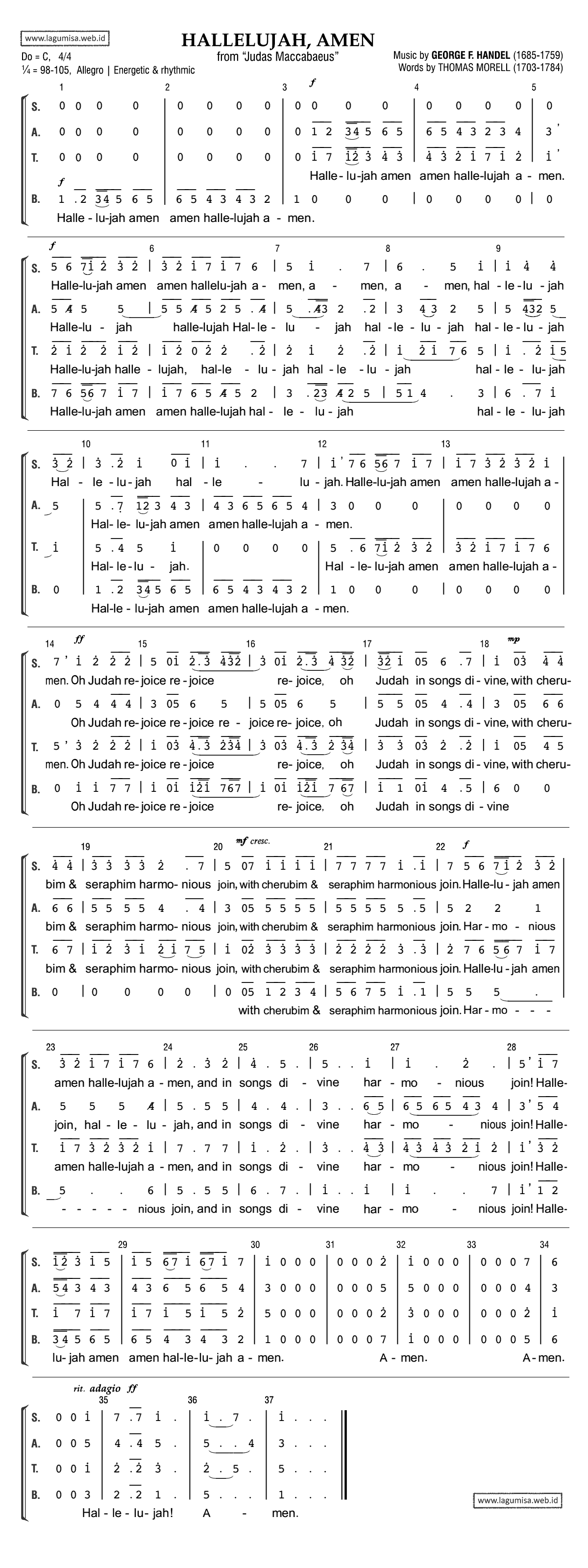 HALLELUJAH, AMEN | FROM "JUDAS MACCABAEUS" ORATORIO | Music by George F. Handel | Words by Thomas Morell | 1 = C, 4/4, 1/4=98-105, Allegro | Energetic & rhythmic |