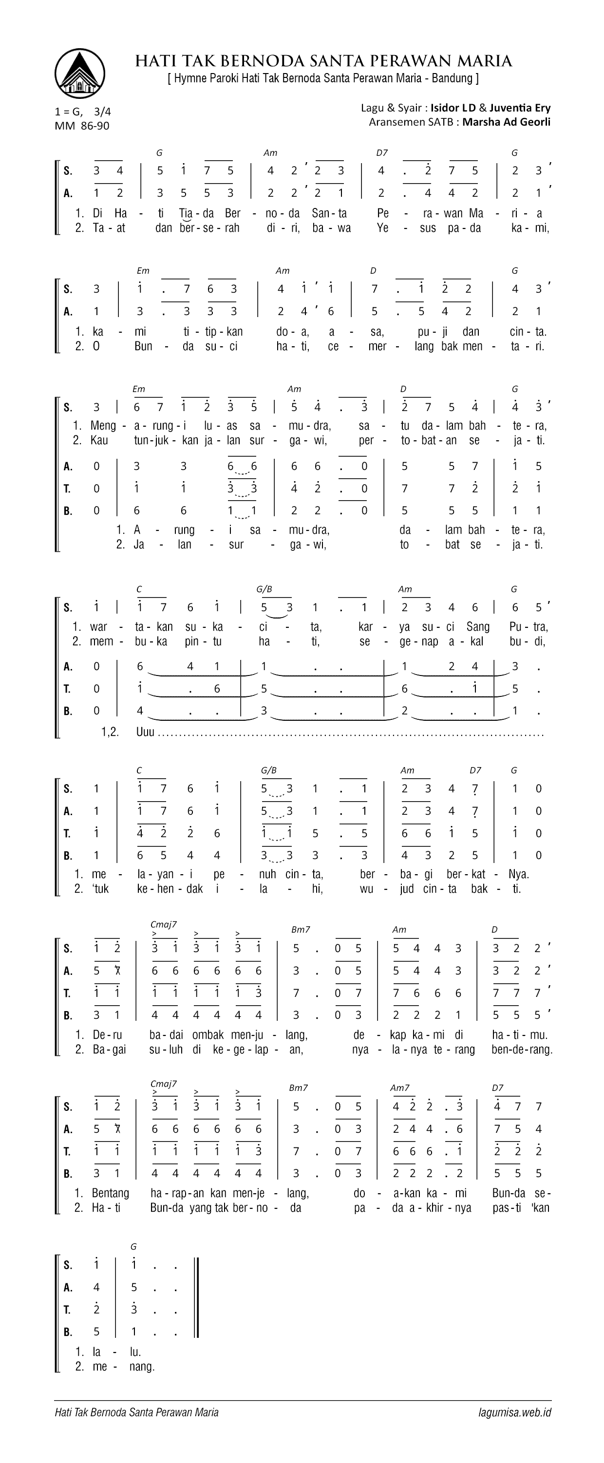 HATI TAK BERNODA SANTA PERAWAN MARIA Hymne Paroki Hati Tak Bernoda Santa Perawan Maria - Bandung Lagu & Syair : Isidor LD & Juventia Ery | Arr Kor : Marsha Ad Georli Do=G atau A, 3/4, MM=86-90