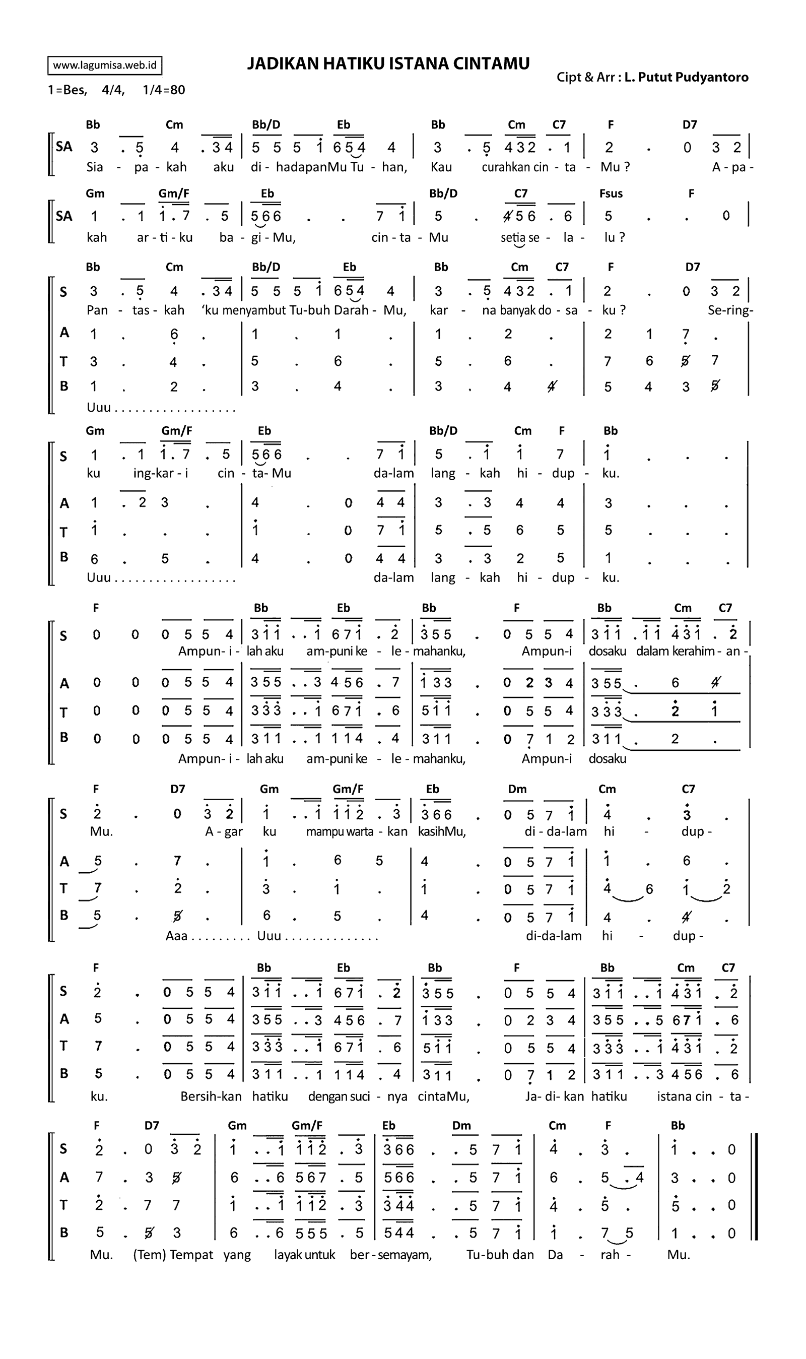 JADIKAN HATIKU ISTANA CINTAMU | LAGU KOMUNI | Lagu & Tata Suara : L Putut Pudyantoro | Do=Bes; 4/4; 1/4=80 |