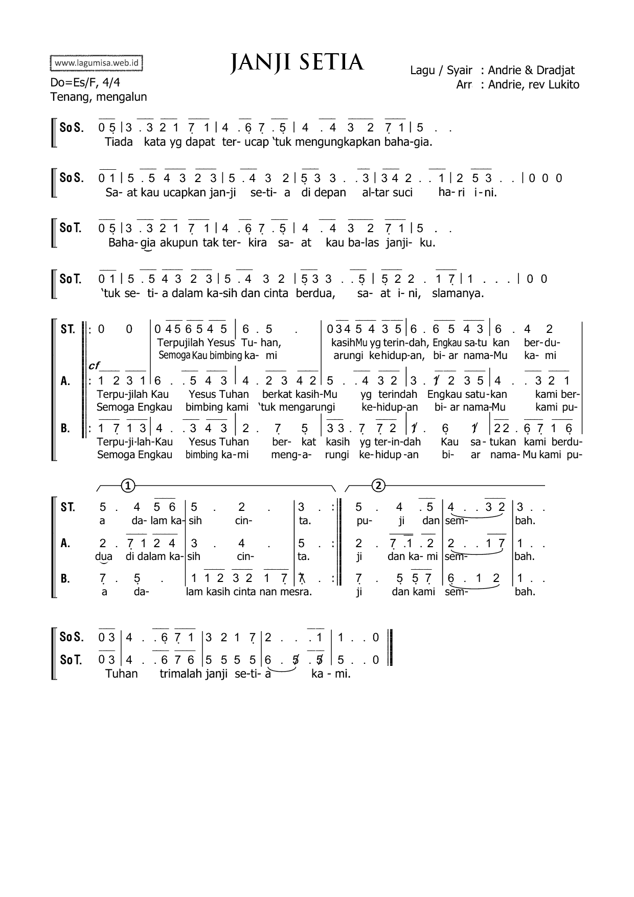 JANJI SETIA | Lagu / Syair : Andrie & Dradjat | Arr : Andrie; rev : Lukito | 1=Es / F, 4/4, Tenang mengalun |