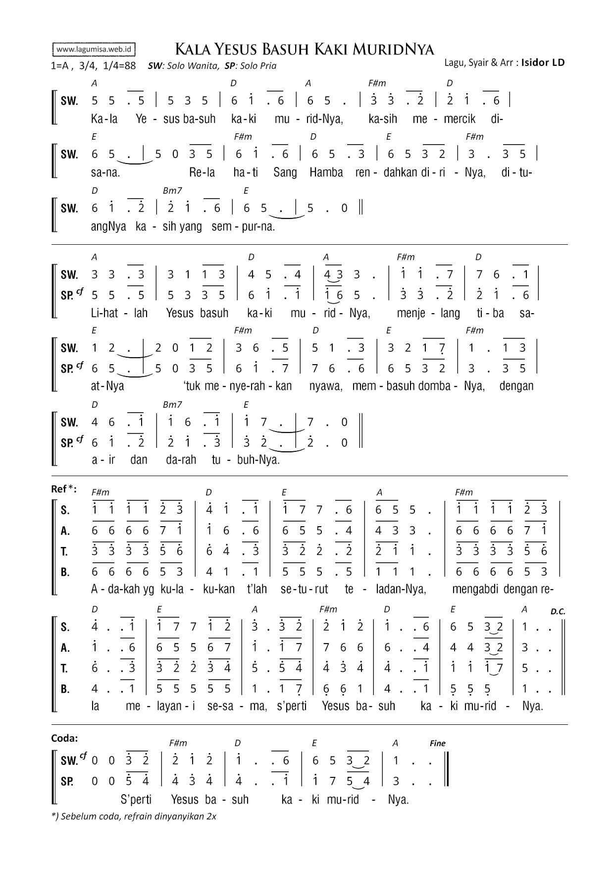 KALA YESUS BASUH KAKI MURIDNYA Lagu, Syair, Aransemen : Isidor LD 1=A, 3/4, 1/4=88