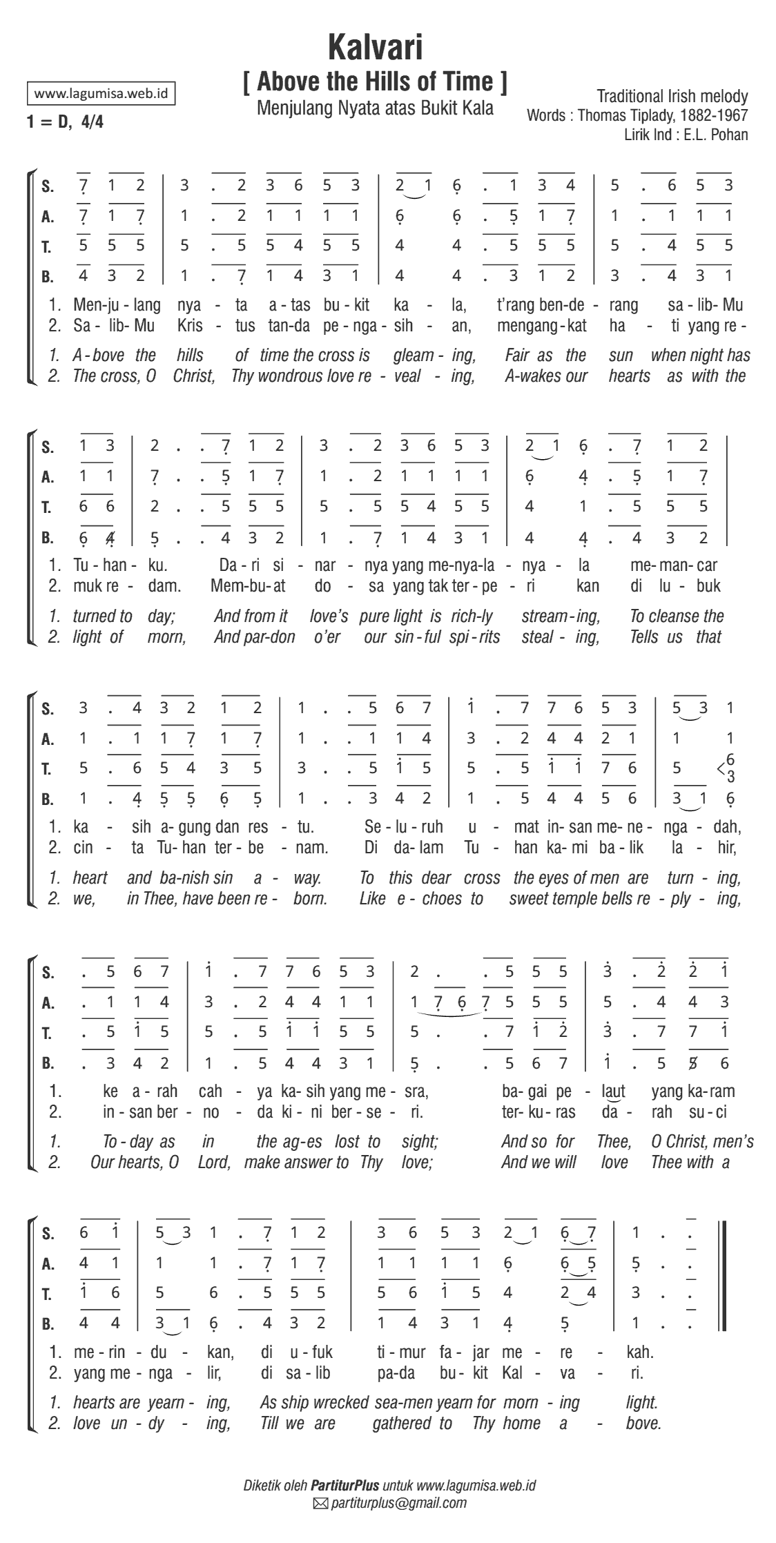 KALVARI | (ABOVE THE HILLS OF TIME) | MENJULANG NYATA ATAS BUKIT KALA | Traditional Irish MelodyWords: Thomas Tiplady 1882-1967; Lirik Ind: E.L Pohan | 1=D, 4/4