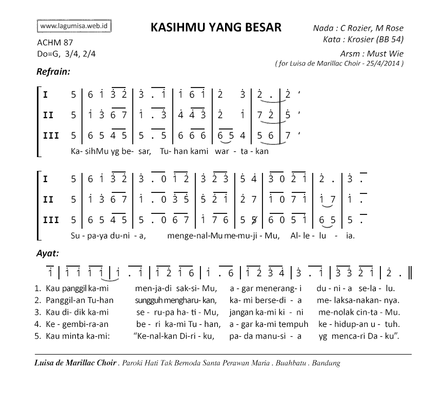 KASIHMU YANG BESAR | Do=G 3/4,2/4 | Nada: C Rozier, M Rose | Kata: Krosier (BB 54) | Arsm : Must Wie (for Luisa de Marillac Choir - 2014) |
