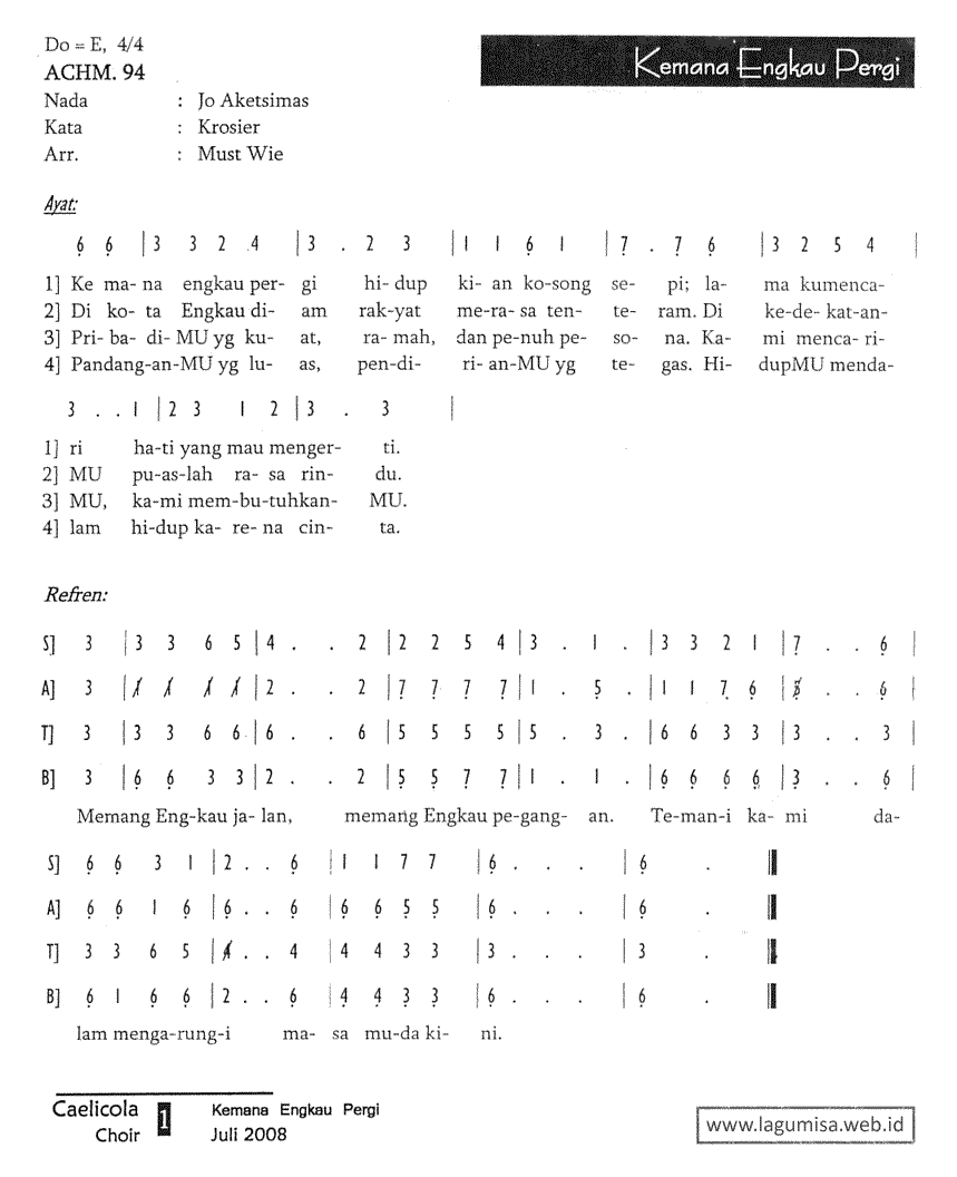 KEMANA ENGKAU PERGI | do=e 4/4 1/4=104 | Nada: Jo Aketsimas | Kata: Krosier | Arr: Must Wie |