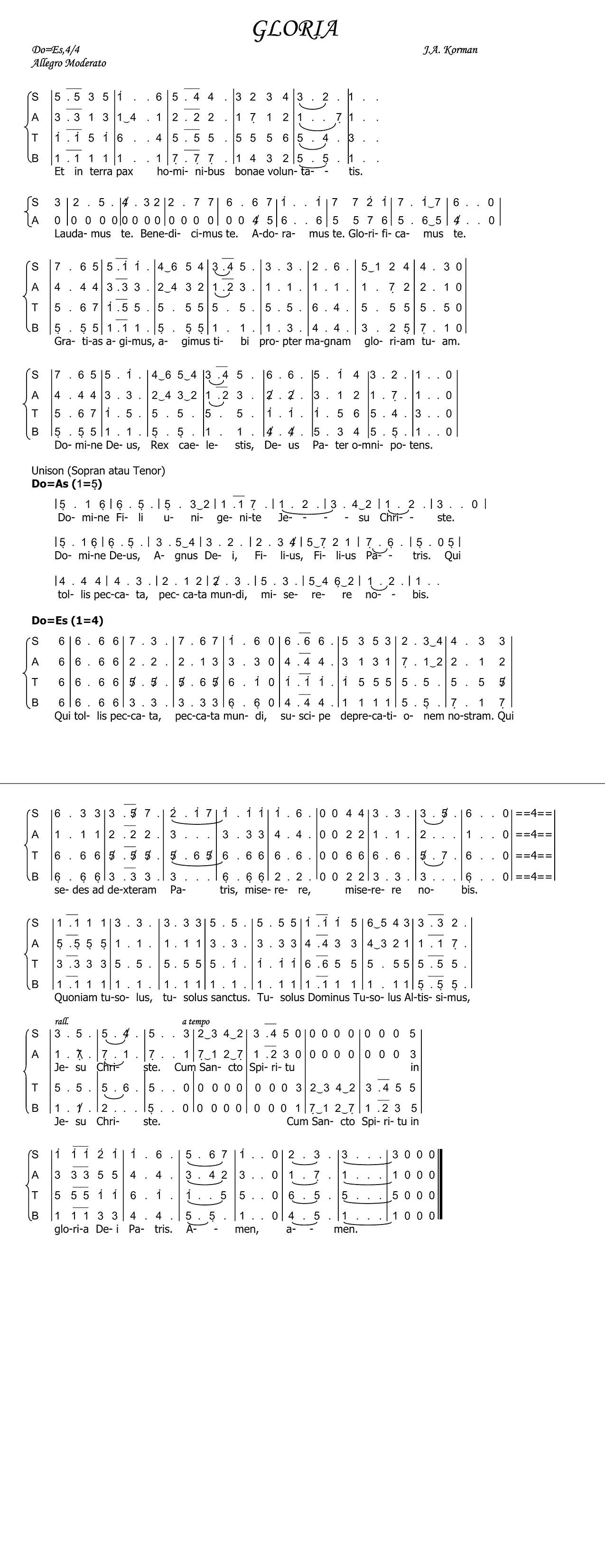 GLORIA - J.A KORMAN | ORDINARIUM KORMAN - Mass in honor of the Blessed Sacrament | Lagu & tata suara: James Andrew Korman (1870 - 1946)Partitur not angka oleh Onggo Lukito | Do=Es 4/4 Allegro Moderato