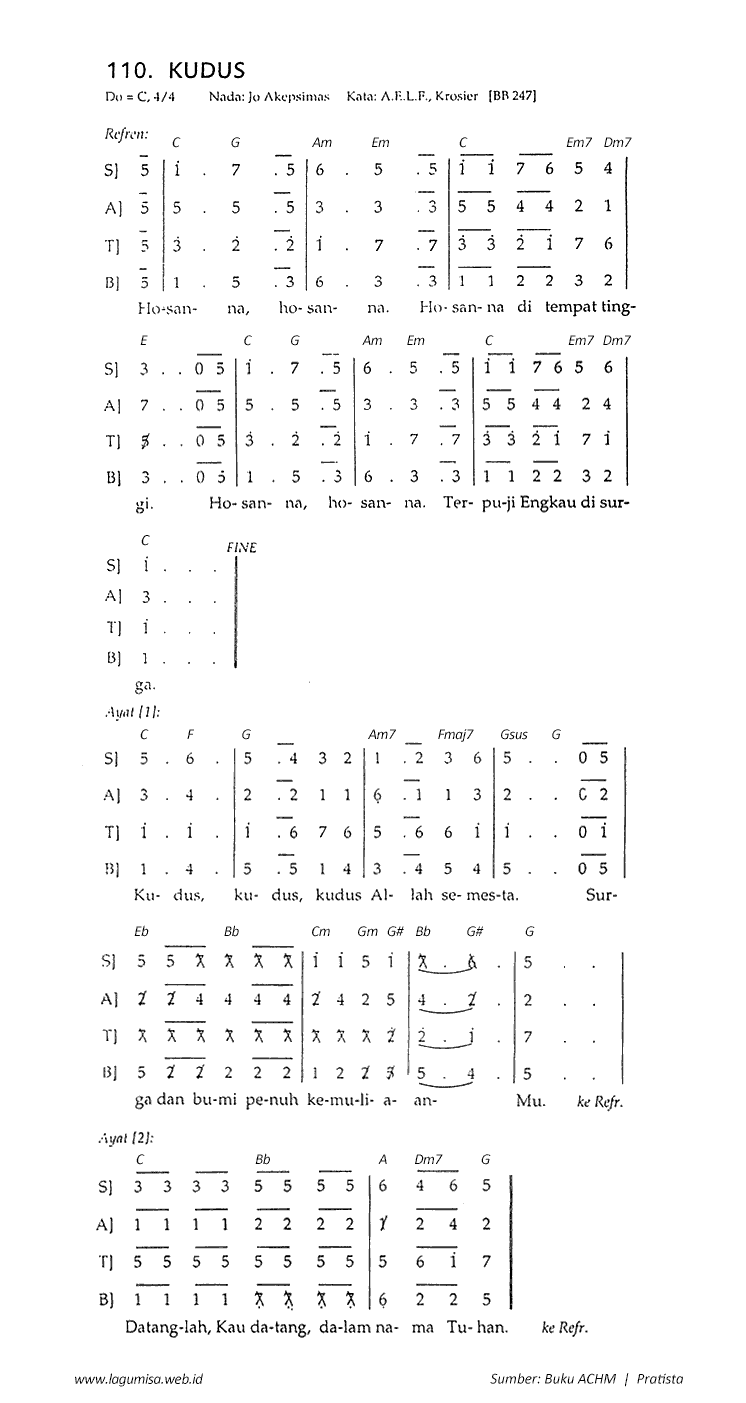 Ref: Hosanna, hosanna, hosanna di tempat tinggi. Hosanna, hosanna, terpuji Engkau di surga. Ayat: 1. Kudus, kudus, kudus Allah semesta, surga dan bumi penuh kemuliaanMu. 2. Datanglah, Kau datang, dalam nama Tuhan. | |||||||||||