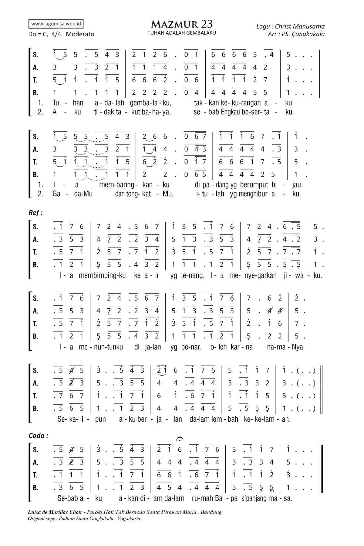 MAZMUR 23 | TUHAN ADALAH GEMBALAKU | Lagu: Christ Manusama | Arr: PS. Çangkakala | Do=C, 4/4, Moderato  |