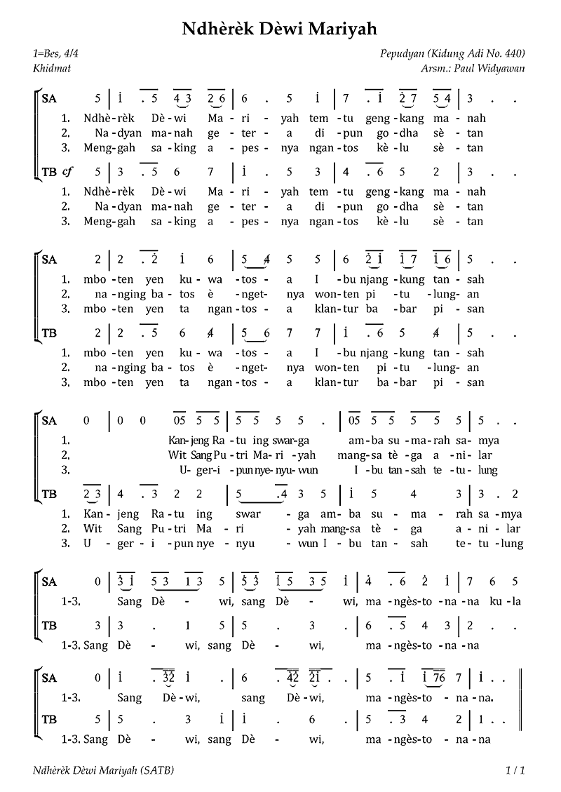 NDHEREK DEWI MARIYAH | (NDHEREK DEWI MARIA) | do=bes 4/4 Khidmat | Pepudyan (Kidung Adi No.440) | Arsm : Paul Widyawan |