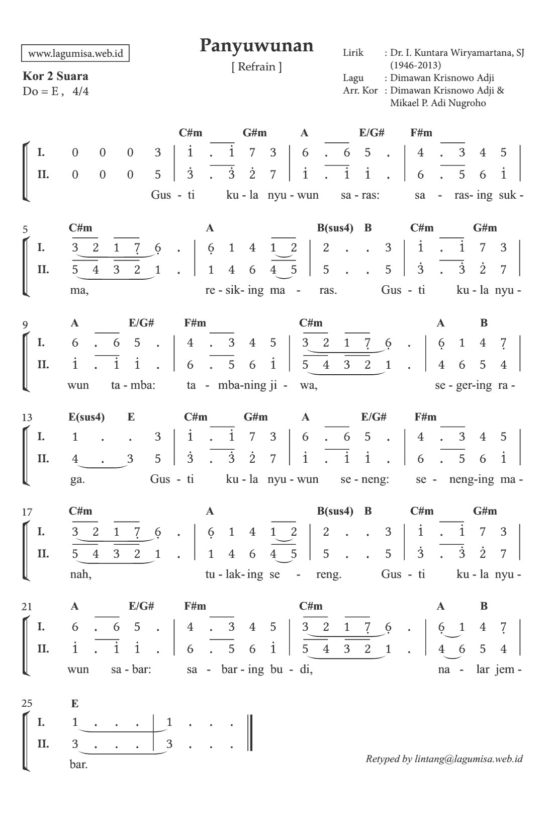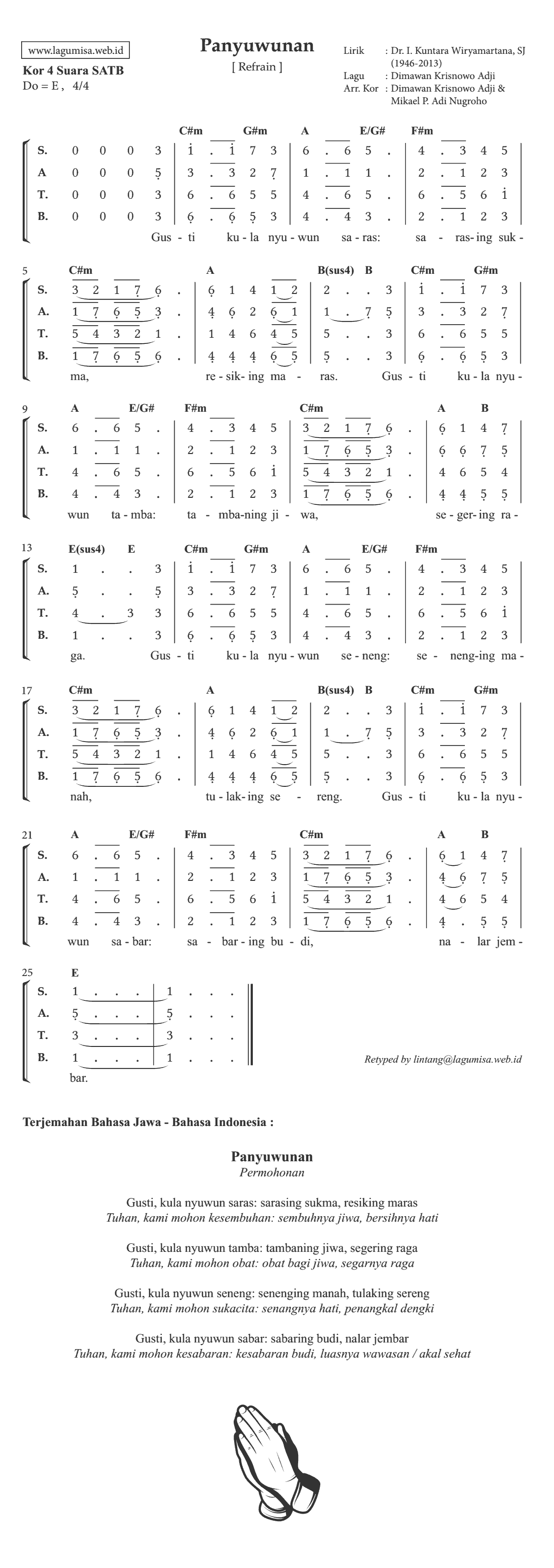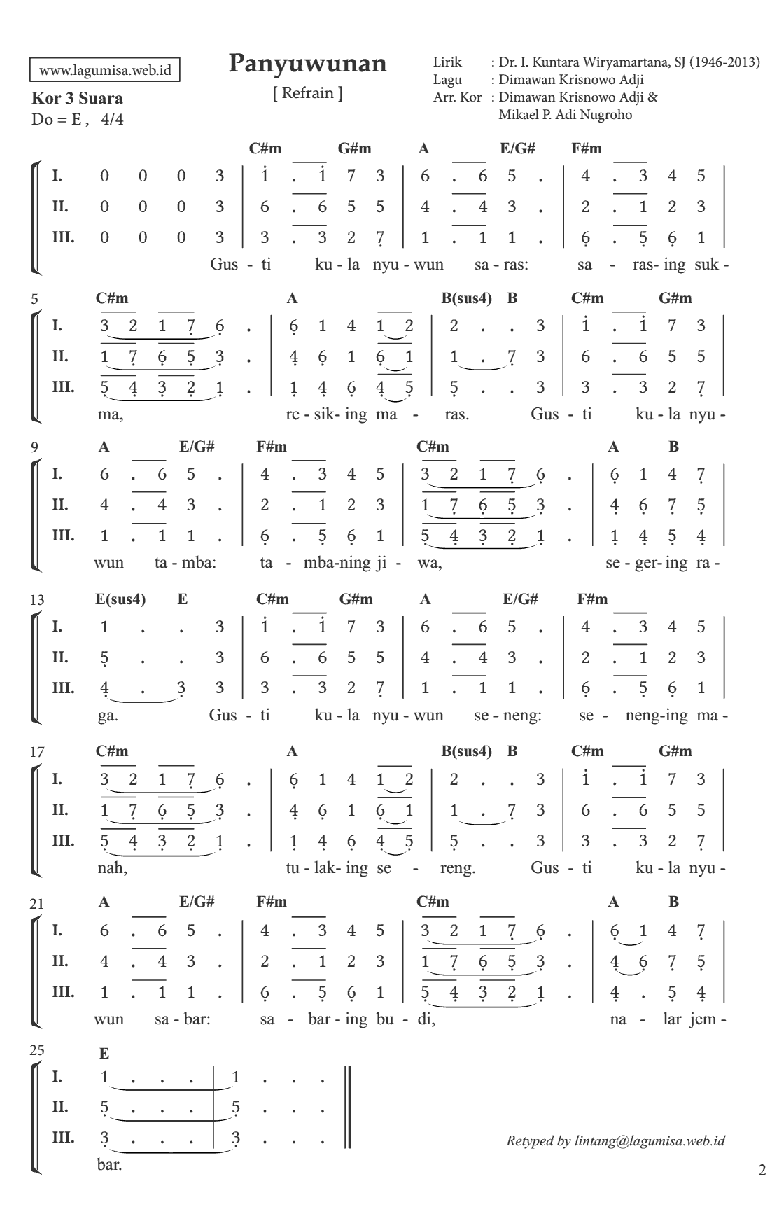 PANYUWUNAN | [ Refrain ] | Lirik : Dr. I. Kuntara Wiryamartana, SJ (1946-2013) | Lagu : Dimawan Krisnowo AdjiArr. Kor : Dimawan Krisnowo Adji & Mikael P. Adi NugrohoSraddha - Jalan Mulia Art Project | Do = E, 4/4 |