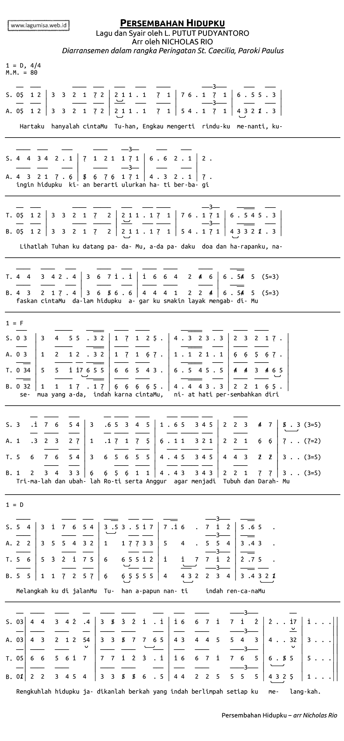 PERSEMBAHAN HIDUPKU | Lagu & Syair : L Putut PudyantoroAransemen SATB : Nicholas Rio | 1 = D, 4/4, MM. 80 |