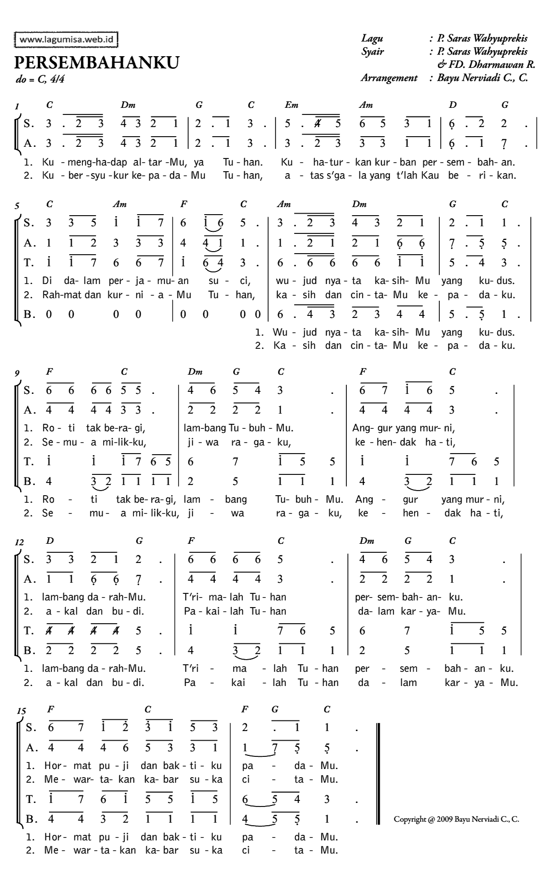 PERSEMBAHANKU Lagu : P. Saras Wahyuprekis Syair : P. Saras Wahyuprekis / FD. Dharwawan R Aransemen : Bayu Nerviadi C.,C 1 = C, 4/4