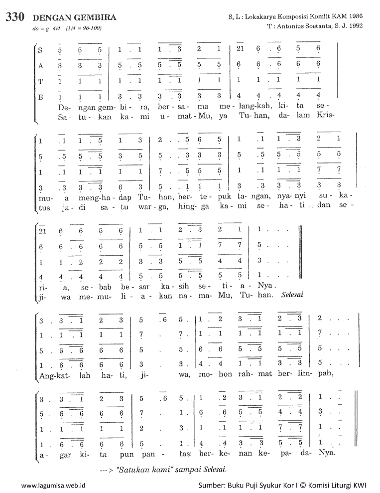 Dengan gembira bersama melangkah Kita semua menghadap Tuhan Bertepuk tangan nyanyi sukaria Sebab besar kasih setiaNya Angkatlah hati jiwa, mohon rahmat berlimpah Agar kita pun pantas berkenan kepadaNya Satukan kami umatMu ya Tuhan Dalam Kristus jadi satu warga Hingga kami sehati dan sejiwa Memuliakan namaMu Tuhan | |||||||||||
