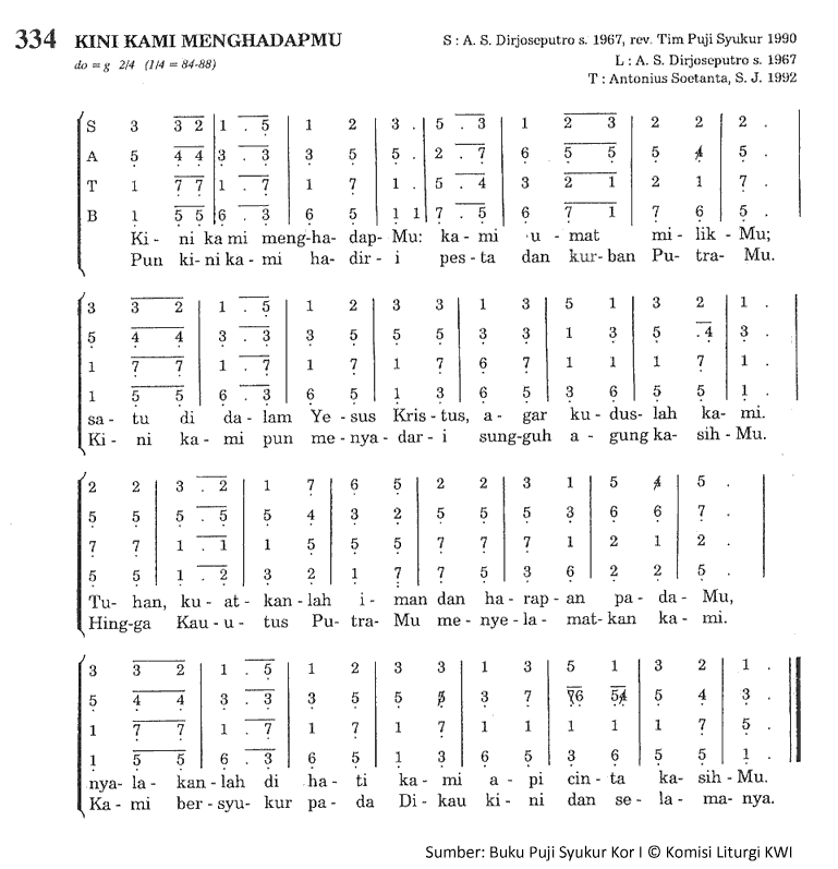 Kini kami menghadapMu: kami umat milikMu satu di dalam Yesus Kristus, agar kuduslah kami Tuhan kuatkanlah iman dan harapan padaMu nyalakanlah di hati kami api cinta kasihMu Pun kini kami hadiri pesta dan kurban PutraMu Kini kami pun menyadari sungguh agung kasihMu Hingga Kau utus PutraMu menyelamatkan kami Kami bersyukur pada Dikau kini dan selamanya | |||||||||||