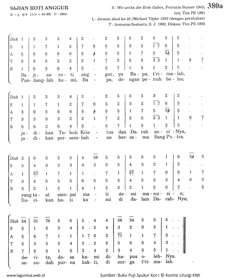 1. Sajian roti anggur, Ya Bapa trimalah, jadikan Tubuh Kristus dan Darah Suci-Nya, yang taat sampai mati demi manusia; derita, dosa kami dihapus oleh-Nya. 2. Pandanglah kami Bapa dengan penuh belas, jadikan persembahan bersama Sang Putera. Sucikan hati kami di dalam Darah-Nya; sesudah purna bakti, di surga trimalah. | |||||||||||