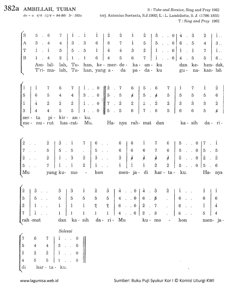 Ambillah Tuhan kemerdekaanku dan kehendak serta pikiranku. Trimalah Tuhan yang ada padaku, gunakanlah seturut hasrat-Mu. Hanya rahmat dan kasih dari-Mu yang kumohon menjadi hartaku. Hanya rahmat dan kasih dari-Mu kumohon menjadi hartaku. | |||||||||||