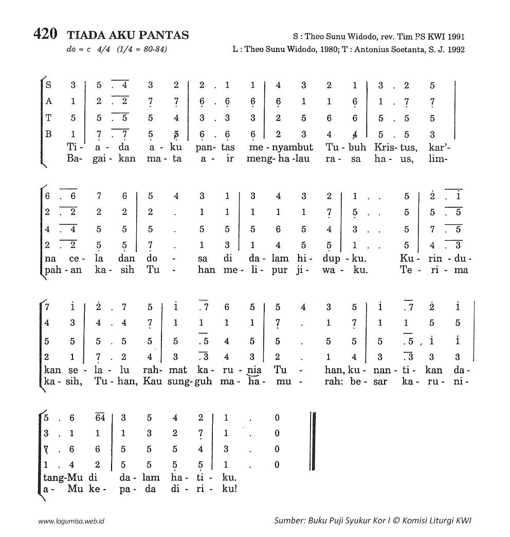 1. Tiada aku pantas menyambut tubuh Kristus. Kar'na cela dan dosa di dalam hidupku. Kurindukan selalu rahmat Karunia Tuhan. Kunantikan datangMu di dalam hatiku. 2. Bagaikan mata air menghalau rasa haus. Limpahan kasih Tuhan melipur jiwaku. Terima kasih Tuhan, Kau sungguh Maha Murah. Besar karuniaMu kepada diriku. | |||||||||||