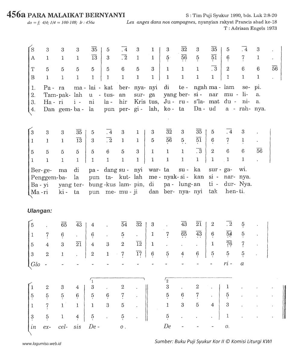 1. Para malaikat bernyanyi di tengah malam sepi. Bergema di padang sunyi warta suka surgawi. Gloria In excelsis Deo. Gloria In excelsis Deo. 2. Tampaklah utusan surga yang bersinar mulia. Penggembala pun takutlah menyaksikan sinarnya. Gloria In excelsis Deo. Gloria In excelsis Deo. 3. Hari ini lahir Kristus, Jurus'lamat dunia. Bayi yang terbungkus lampin, di palungan tidur-Nya. Gloria In excelsis Deo. Gloria In excelsis Deo. 4. Dan gembala pun pergilah, kota Daud arahnya. Mari kita pun memuji dan bernyanyi tak henti. Gloria In excelsis Deo. Gloria In excelsis Deo. | |||||||||||