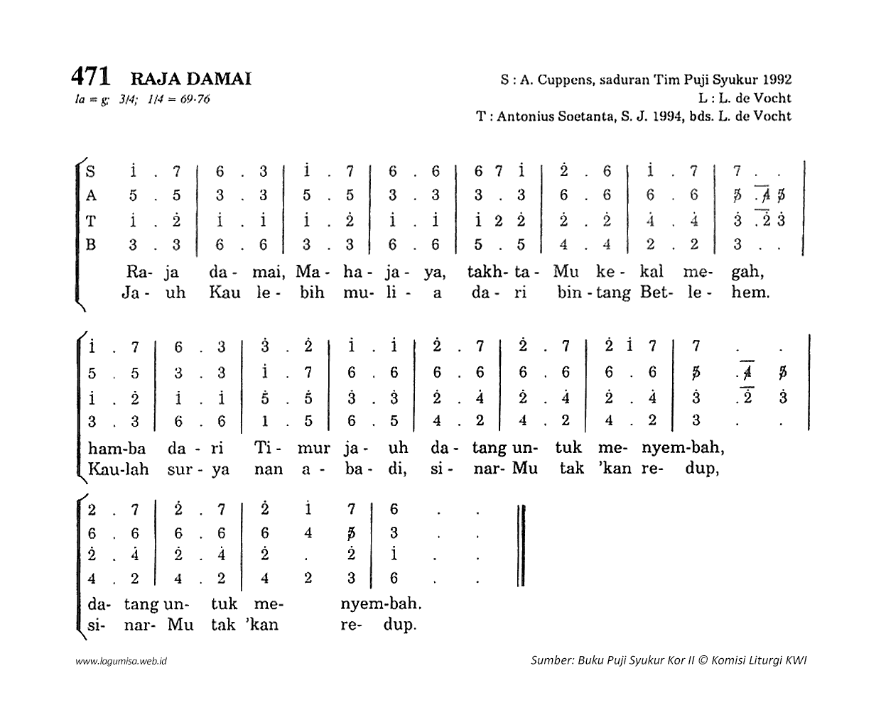 Raja Damai, Mahajaya, takhtaMu kekal megah hamba dari Timur jauh datang untuk menyembah datang untuk menyembah Jauh Kau lebih mulia dari bintang Betlehem Kau lah surya nan abadi, sinar-Mu tak 'kan redup sinar-Mu tak 'kan redup | |||||||||||