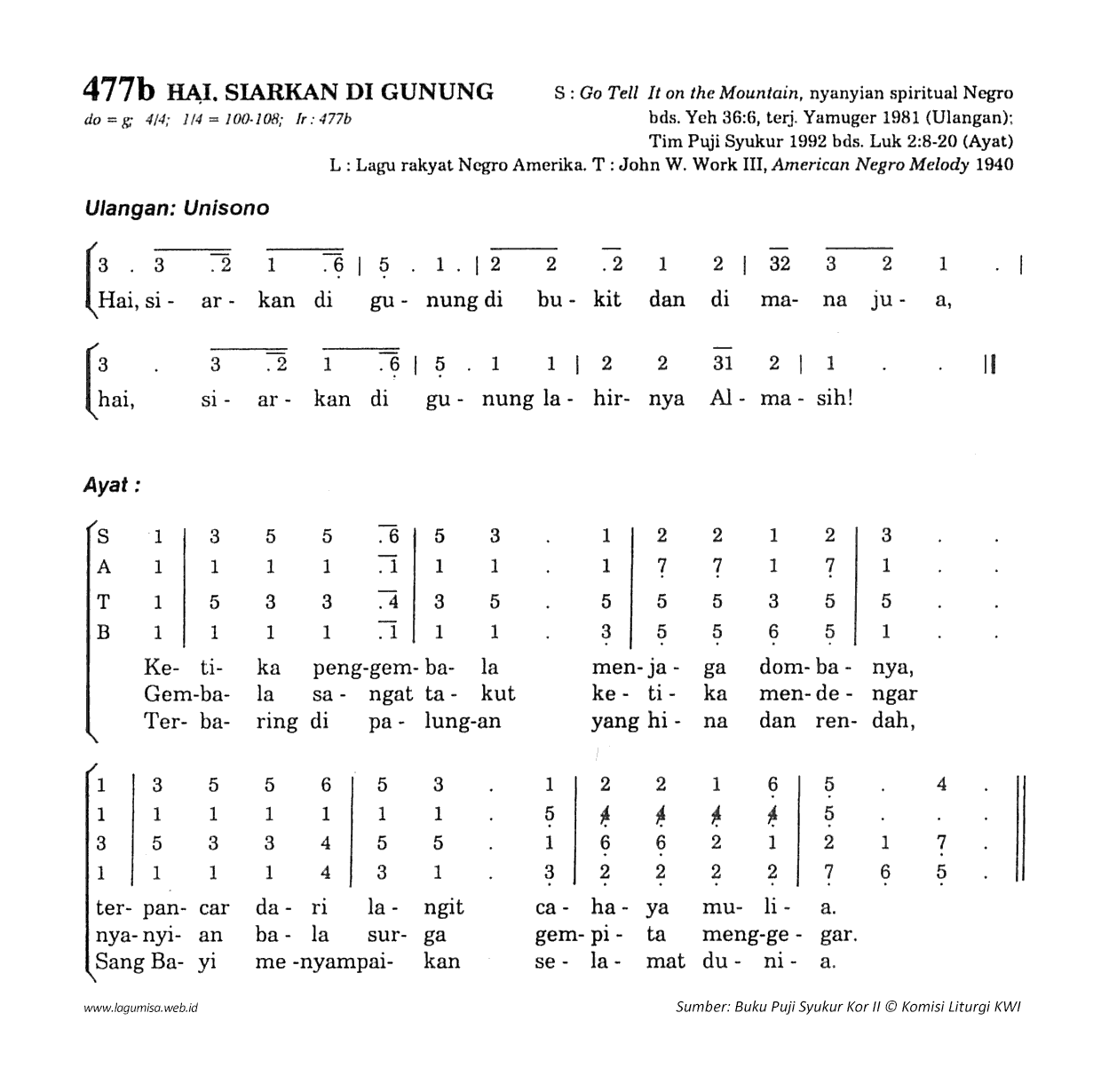 PS-477b | HAI SIARKAN DI GUNUNG | Go Tell It On The Mountain | do=G; 4/4; 1/4=100-108 |