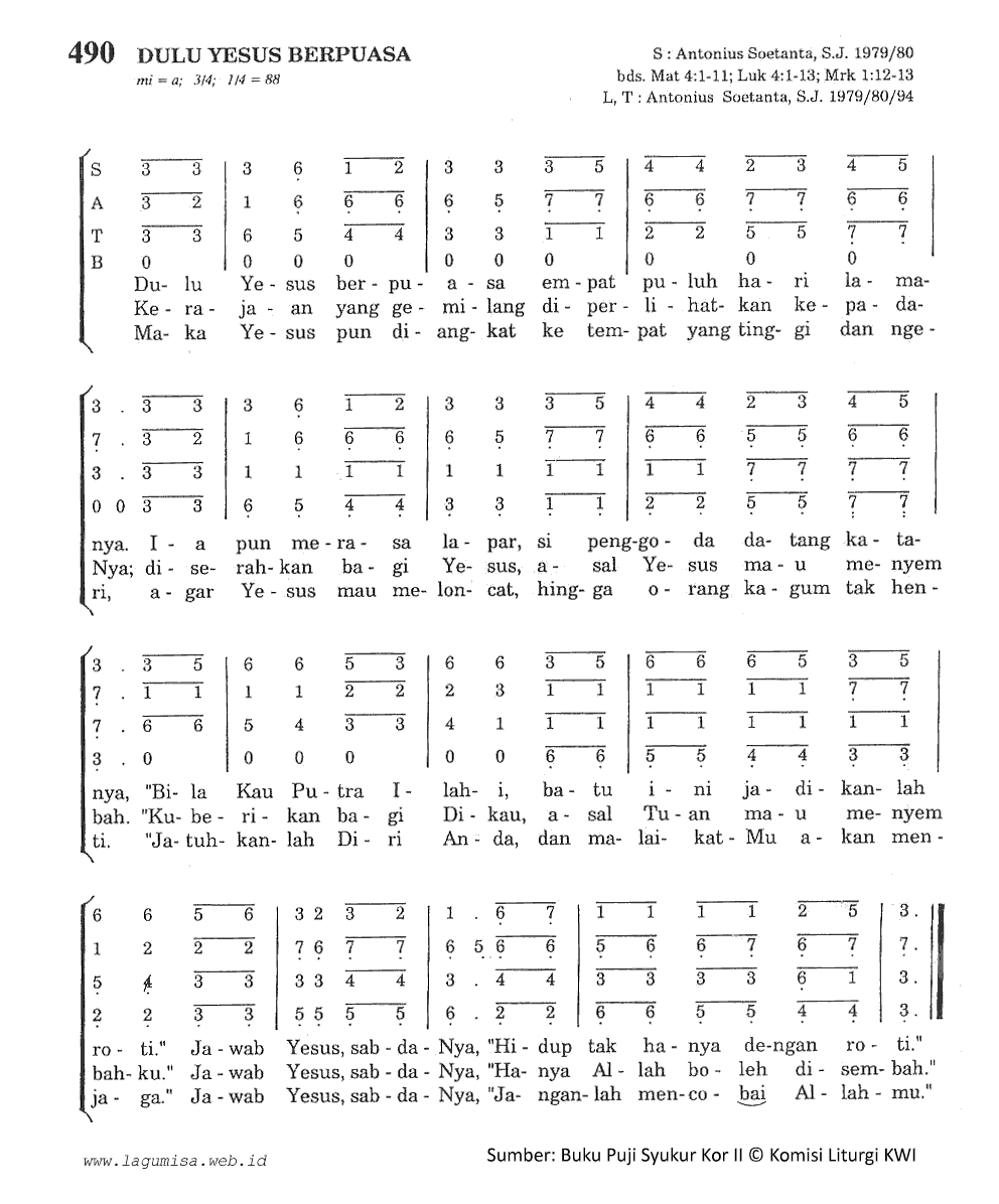 Dulu Yesus berpuasa empat puluh hari lamanya Ia pun merasa lapar, si penggoda datang katanya "Bila Kau Putra Ilahi, batu ini jadikanlah roti" Jawab Yesus sabda-Nya: Hidup tak hanya dengan roti Kerajaan yang gemilang diperlihatkan kepadaNya Diserahkan bagi Yesus asal Yesus mau menyembah "Ku berikan bagi Dikau asal Tuan mau menyembahku" Jawab Yesus sabda-Nya: "Hanya Allah boleh disembah" Maka Yesus pun diangkat ke tempat yang tinggi dan ngeri agar Yesus mau meloncat hingga orang kagum tak henti "Jatuhkanlah diri Anda dan malaikatMu akan menjaga" Jawab Yesus sabda-Nya: "Janganlah mencobai Allahmu" | |||||||||||