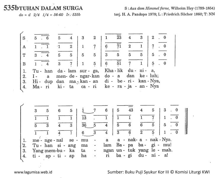 1. Tuhan dalam surga, Khalik Dunia Mengenal semua anak-anakNya 2. Ia mendengarkan doa dan keluh; Tuhan siang malam Bapa bagimu! 3. Hidup dan makanan di berikanNya Yang membuka tangan untuk yang lemah 4. Mari kita cari kerajaanNya Tiap-tiap hari bagi dunia! | |||||||||||