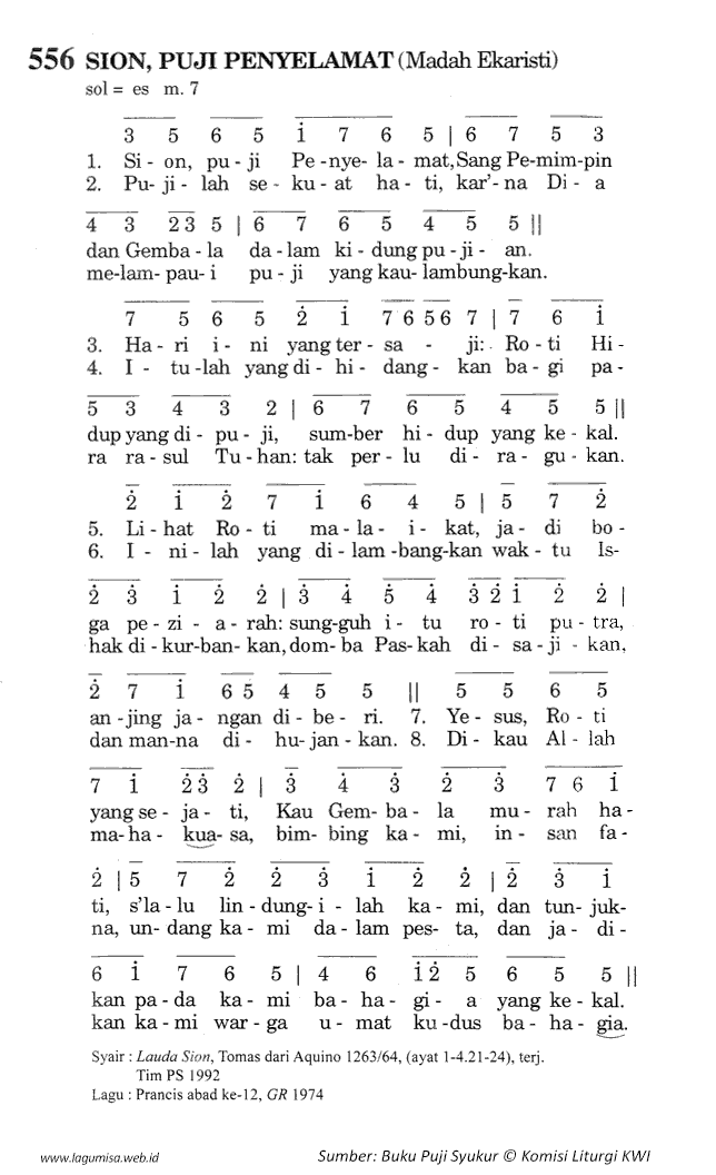 PS-556 SION, PUJI PENYELAMAT ( Madah Ekaristi ) LAUDA SION SALVATOREM | sol=es | m.7 Dinyanyikan sesudah Bacaan ke-2 pada Hari Raya Tubuh dan Darah Kristus (sebelum BPI / Alleluia) Ini adalah VERSI LAMA yang ada di Buku Puji Syukur. Klik di sini untuk melihat versi terbaru dari Buku Mazmur Edisi Revisi Th. 2021