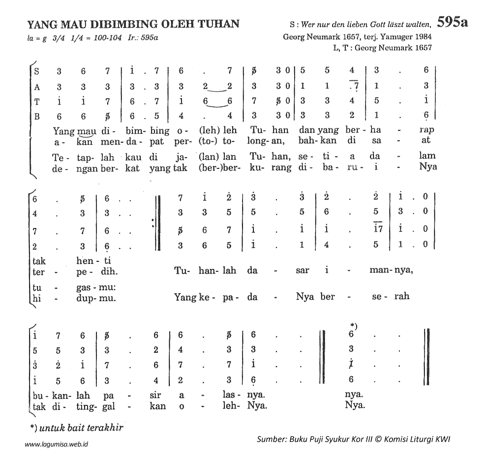 Yang mau dibimbing oleh Tuhan dan yang berharap tak henti akan mendapat pertolongan, bahkan di saat terpedih. Tuhanlah dasar imannya, bukanlah pasir alasnya. Tetaplah kau di jalan Tuhan, setia dalam tugasmu dengan berkat yang tak berkurang dibaruiNya hidupmu. Yang kepadaNya berserah tak ditinggalkan olehNya. | |||||||||||