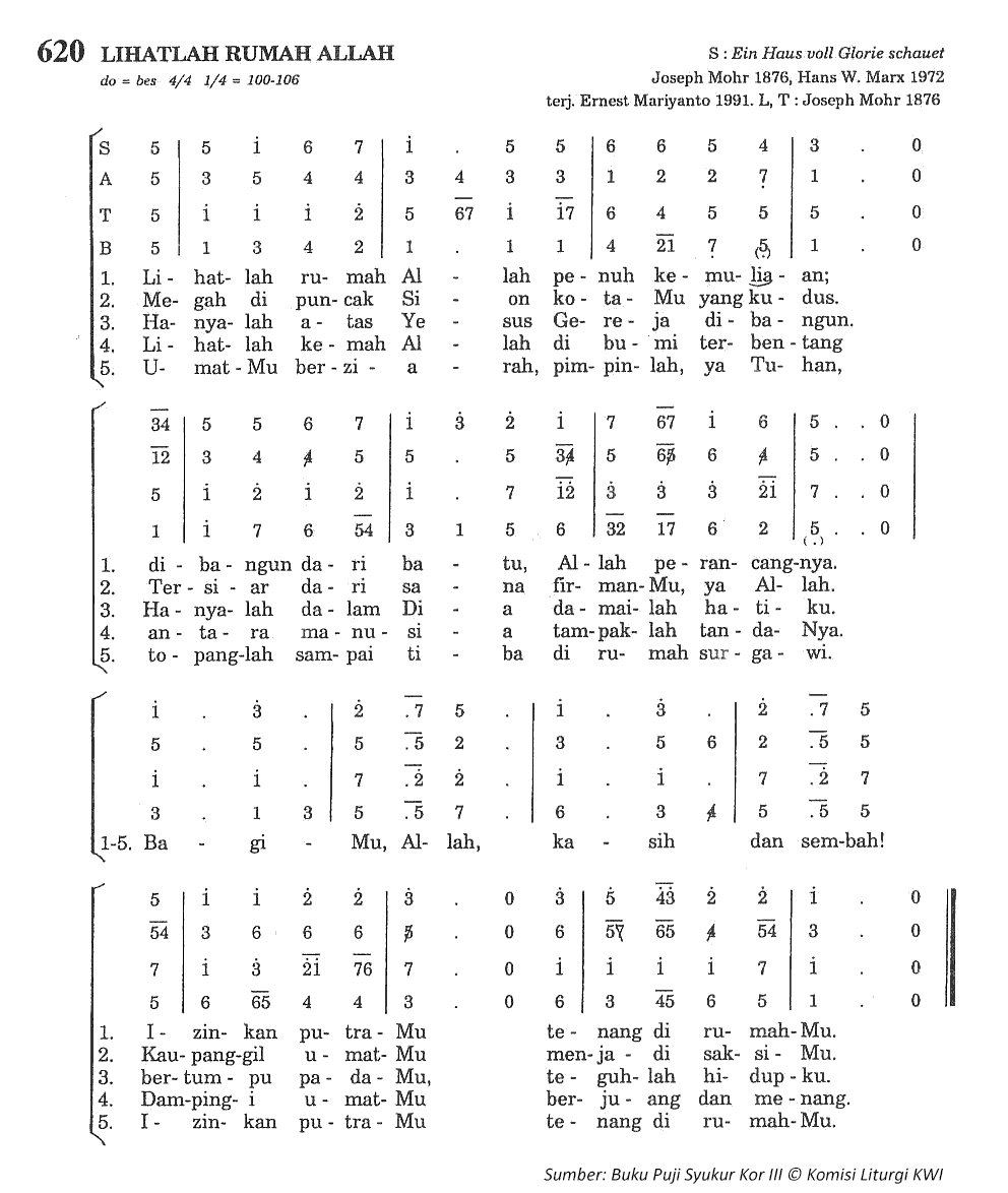 Lihatlah rumah Allah penuh kemuliaan Dibangun dari batu, Allah perancangnya BagiMu Allah, kasih dan sembah Izinkan putraMu tenang di rumahMu Megah di puncak Sion KotaMu yang kudus Tersiar dari sana firmanMu ya Allah BagiMu Allah puji dan sembah Kau panggil umatMu menjadi saksiMu Hanyalah atas Yesus, Gereja dibangun Hanyalah dalam Dia damailah hatiku BagiMu Allah puji dan sembah Bertumpu padaMu teguhlah hidupku Lihatlah kemah Allah di bumi terbentang Antara manusia tampaklah tandaNya BagiMu Allah puji dan sembah Dampingi umatMu berjuang dan menang UmatMu berziarah pimpinlah ya Tuhan Topanglah sampai tiba di rumah surgawi BagiMu Allah puji dan sembah Izinkan putraMu tenang di rumahMu | |||||||||||