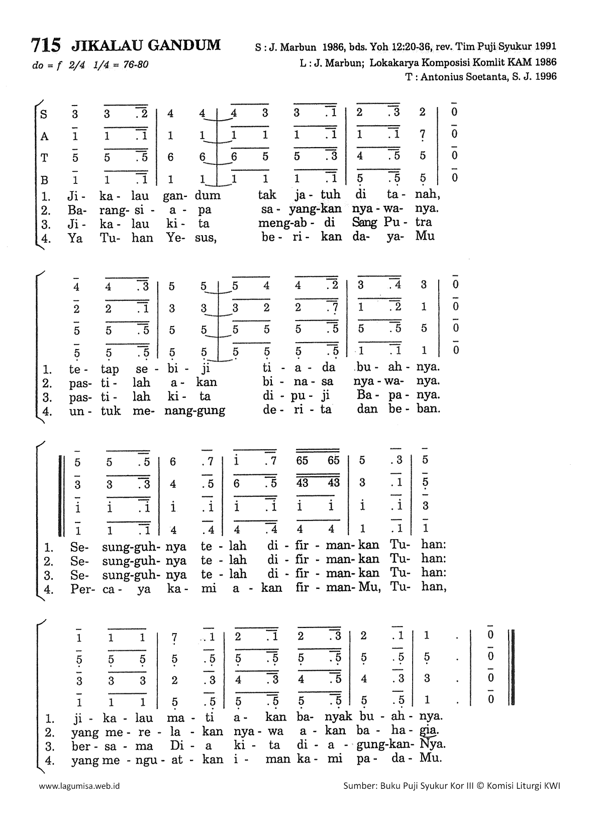 1. Jikalau gandum tak jatuh di tanah, tetap sebiji tiada buahnya. Sesungguhnya telah difirmankan Tuhan: jikalau mati akan banyak buahnya. 2. Barangsiapa sayangkan nyawanya pastilah akan binasa nyawanya. Sesungguhnya telah difirmankan Tuhan: yang merelakan nyawa akan bahagia. 3. Jikalah kita mengabdi Sang Putra pastilah kita dipuji Bapanya. Sesungguhnya telah difirmankan Tuhan: bersama Dia kita diagungkan-Nya. 4. Ya Tuhan Yesus, berikan daya-Mu untuk menanggung derita dan beban. Percaya kami akan firman-Mu, Tuhan, yang menguatkan iman kami pada-Mu. | |||||||||||