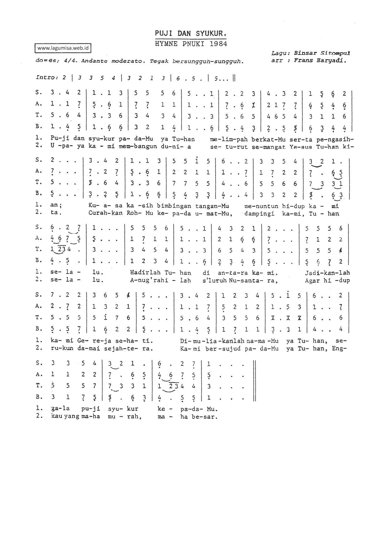 PUJI DAN SYUKUR [ Hymne PNUKI 1984 ] Lagu : Binsar Sitompul | Arsm : Frans Haryadi Do=Es, 4/4, Andante Moderato, Tegak Bersungguh-sungguh