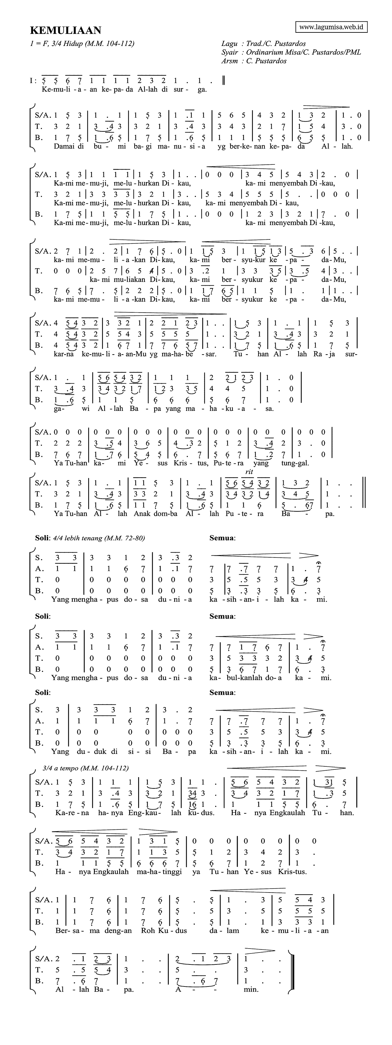 KEMULIAAN - PUSTARDOS ORDINARIUM MISA NATAL Lagu: Trad / C. Pustardos Syair: Ordinarium Misa / C. Pustardos / PML Arsm: C. Pustardos 1 = F, 3/4 Hidup (M.M. 104-112)