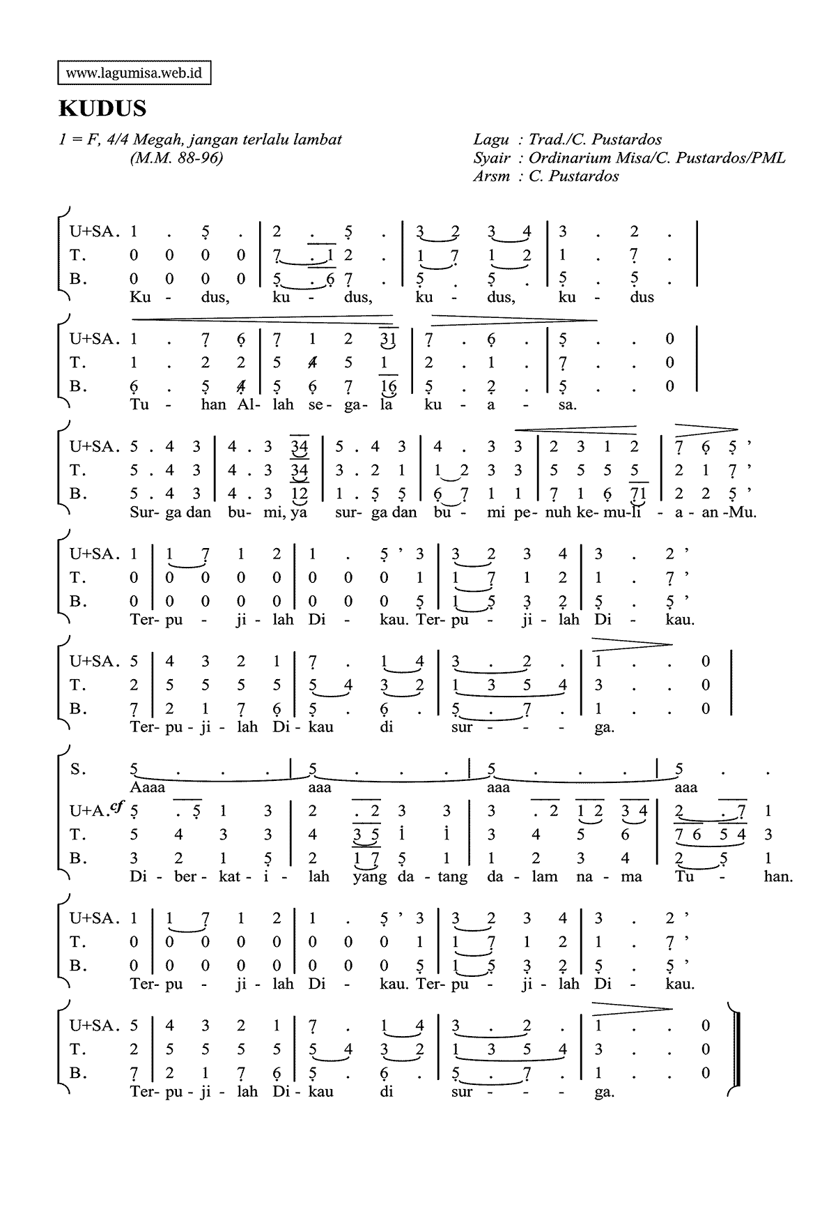 KUDUS - PUSTARDOS | ORDINARIUM MISA NATAL | Lagu: Trad / C. Pustardos Syair: Ordinarium Misa / C. Pustardos / PML Arsm: C. Pustardos | 1 = F, 4/4 Megah, jangan terlalu lambat (M.M. 88-96) |