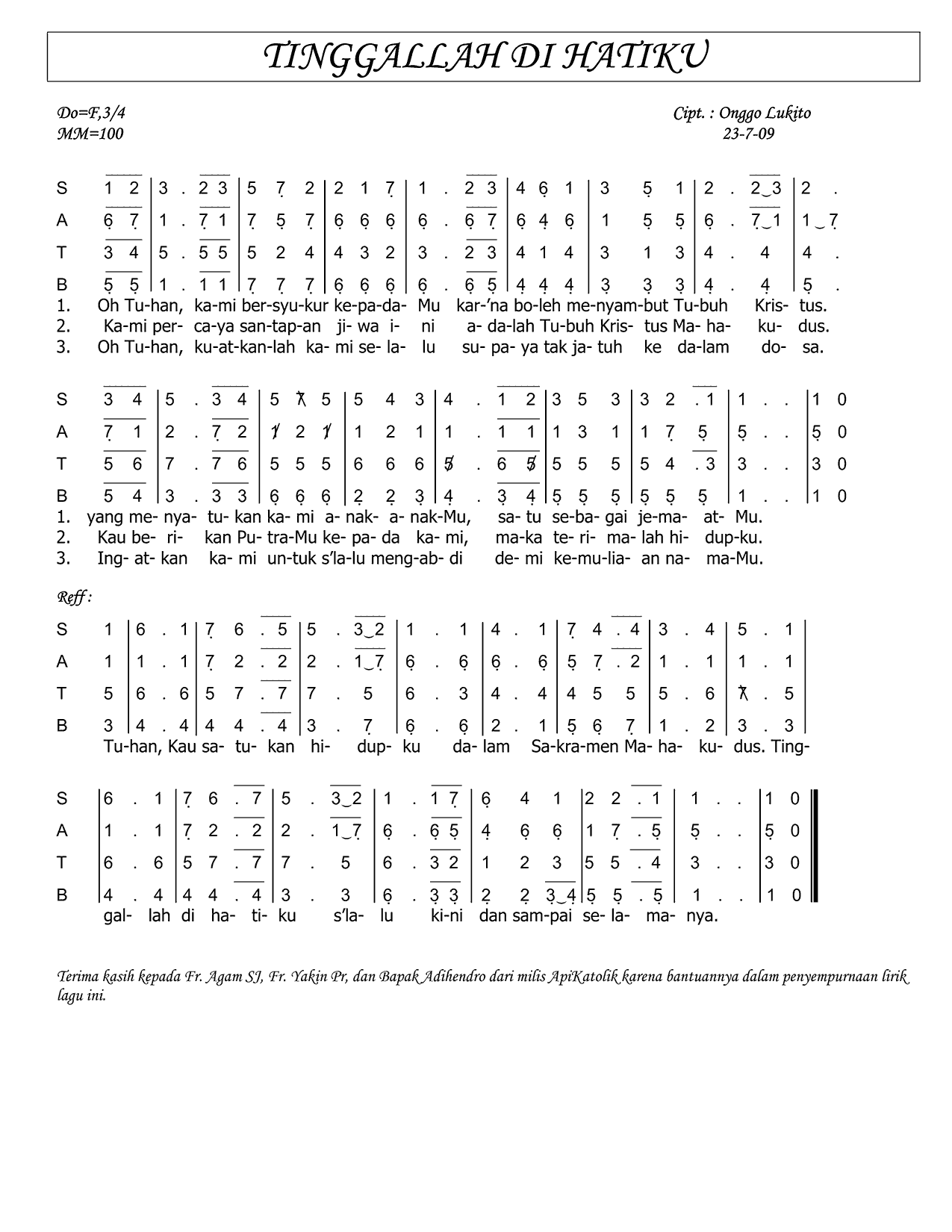 TINGGALLAH DI HATIKU Cipt. : Onggo Lukito Do = F; 3/4