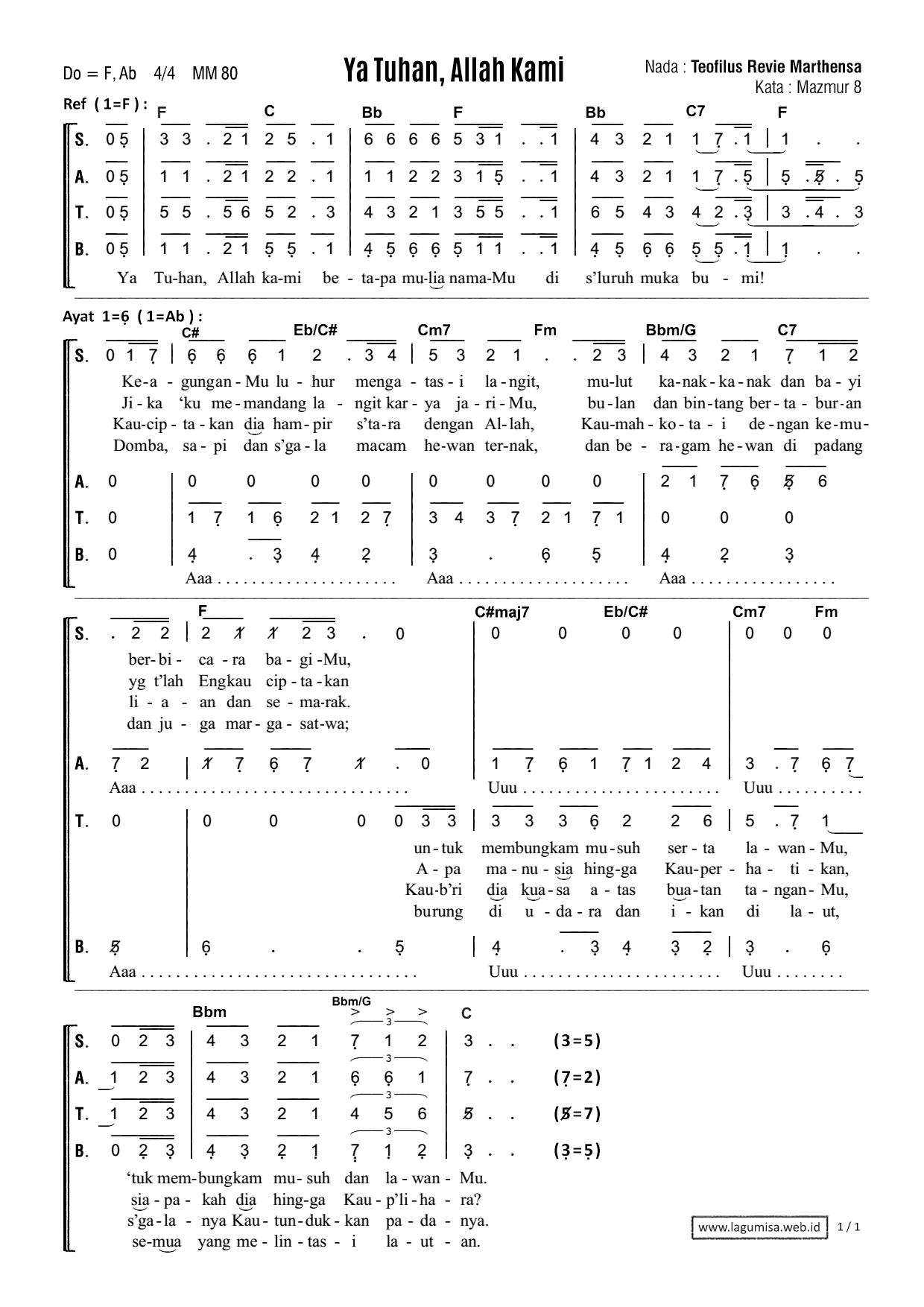 YA TUHAN, ALLAH KAMI Nada : Teofilus Revie Marthensa | Kata : Mazmur 8 Do = F, Ab; 4/4, MM 80