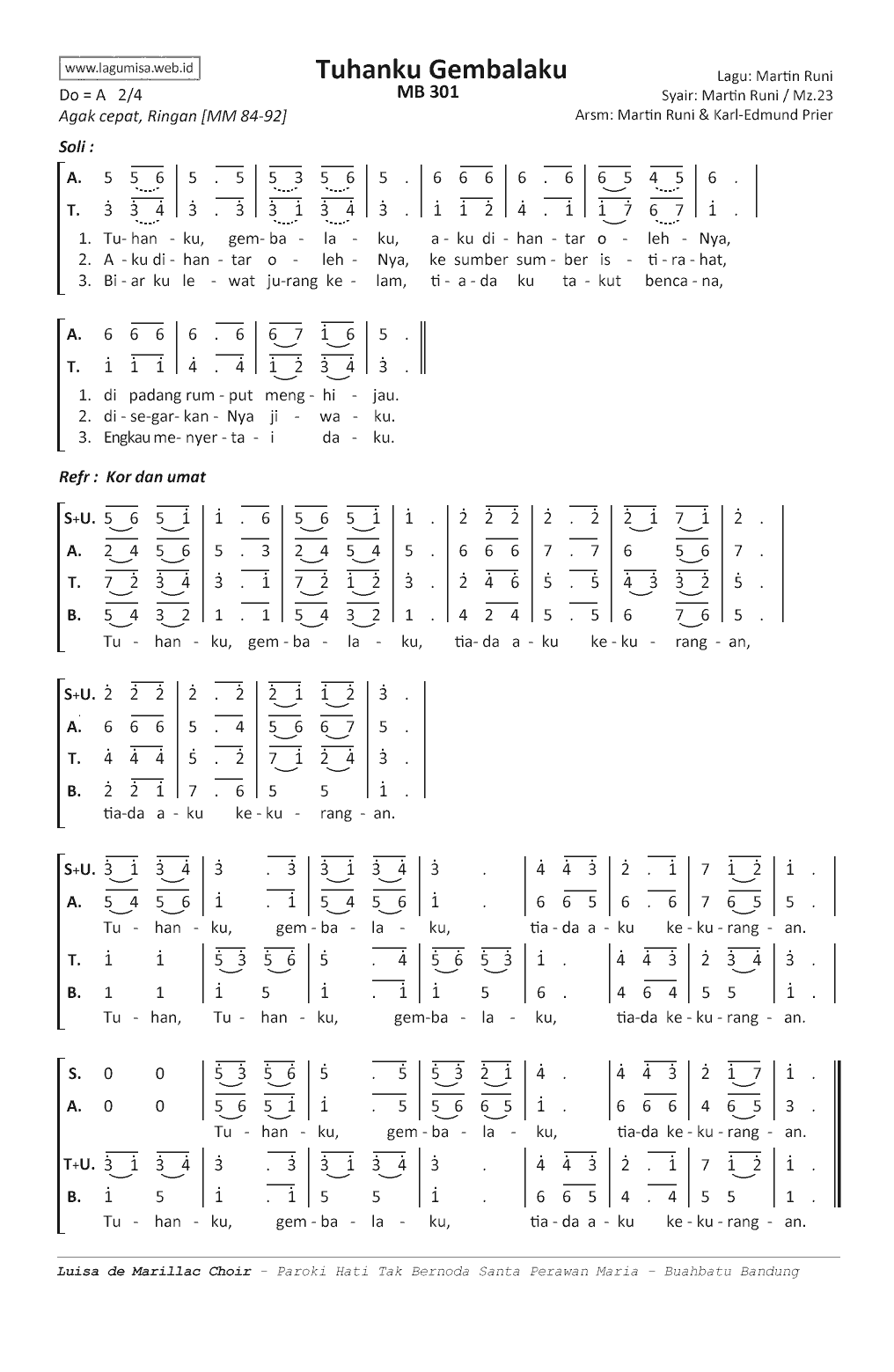 Lirik MB-301 | TUHANKU GEMBALAKU | Lagu: Martin Runi | Syair: Martin Runi / Mz.23 | Arr: Martin Runi & Karl-Edmund Prier | Do=A 2/4 Agak cepat, Ringan [MM 84-92] |