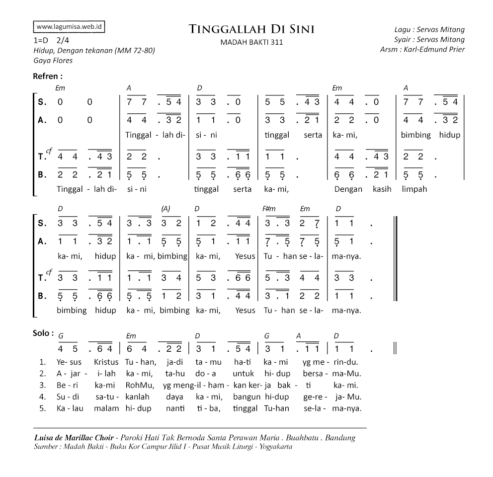 Lirik MB-311 | TINGGALLAH DI SINI | Lagu dan Syair: Servas Mitang | Arr: Karl-Edmund Prier | 1=D; 2/4; MM 76-84 | Gaya Flores |