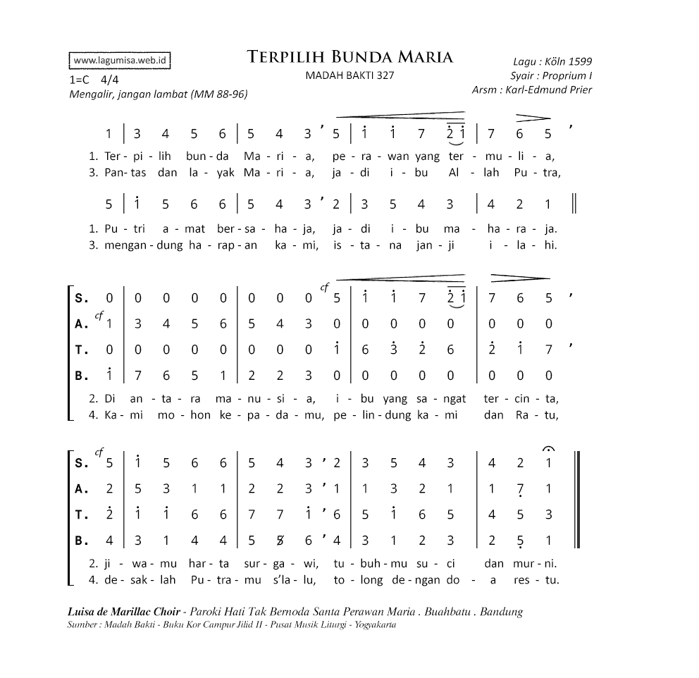 Lirik MB-327 | TERPILIH BUNDA MARIA | Lagu: Koln 1599 | Syair: Proprium I | Arsm: Karl-Edmund Prier | do=C; 4/4; MM=88-96 | Mengalir, jangan lambat | (Puji Syukur 450 - Maria kau penuh berkat) |
