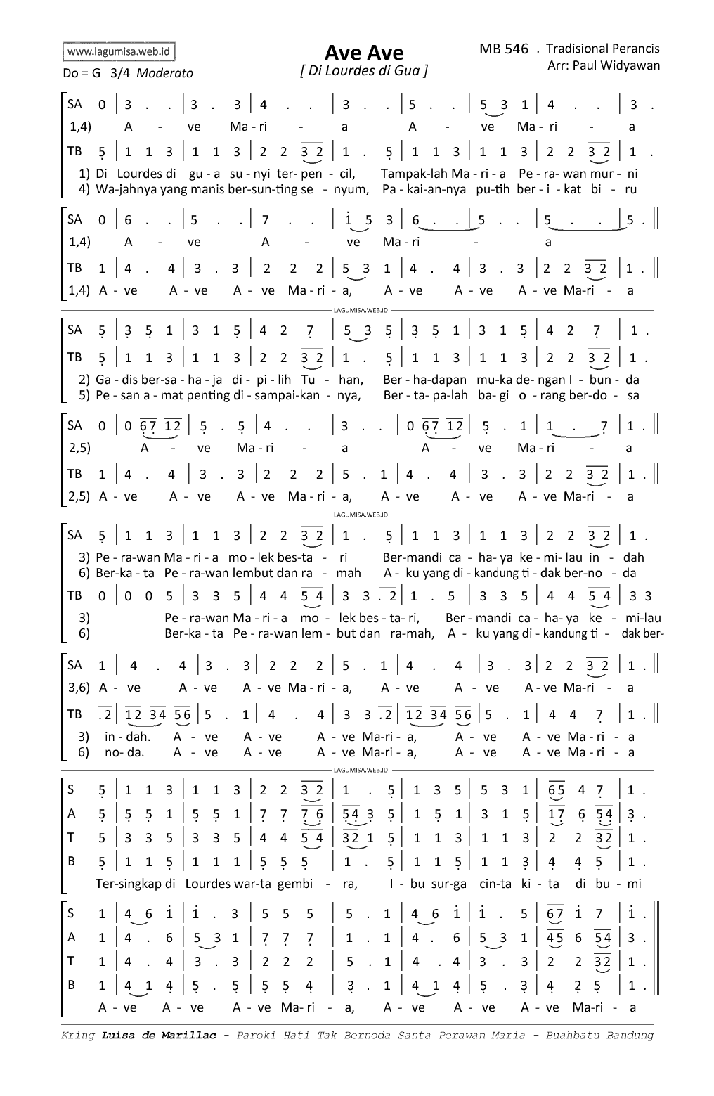 Lirik MB-546 | AVE AVE / Di Lourdes di Gua | (Immaculate Mary) | Do=G 3/4 moderato | Arr: Paul Widyawan |